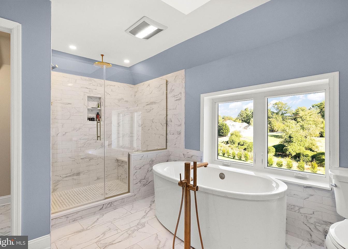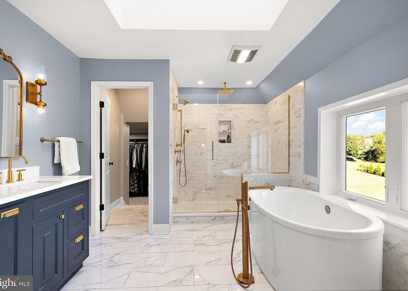 A spacious master bathroom reveals a harmonious blend of modern and classic design elements. Soft blue walls contrast with white marble tile flooring, enhancing the serene atmosphere. The sleek freestanding bathtub, accented by a wooden faucet, stands against a large window that overlooks greenery outside. A glass-enclosed shower features gold fixtures and a stylish showerhead, harmonizing with the elegant towel rack and vanity hardware. The dark wood vanity, complete with gold hardware, adds warmth to the space. Thoughtful architectural details, such as recessed lighting and a skylight, infuse the room with natural light and spaciousness.