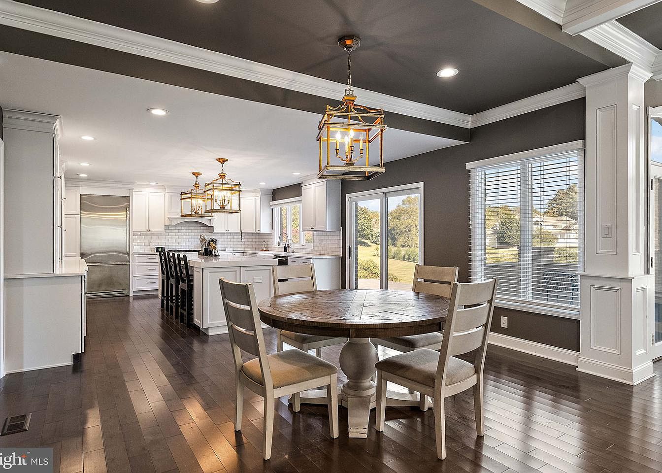 An inviting kitchen space featuring a round wooden dining table with soft seating, ideal for casual meals. Modern white cabinetry complements stainless steel appliances, enhancing a fresh and airy ambiance. The dark hardwood floor adds warmth, contrasting with the sleek white and gray kitchen design. Two elegant pendant lights hang above the island, casting a gentle glow. Large windows with blinds allow natural light to flood in, offering a picturesque view of the outdoors. The combination of traditional and contemporary elements creates a harmonious aesthetic, making the area not just functional but also a delightful focal point for gatherings.