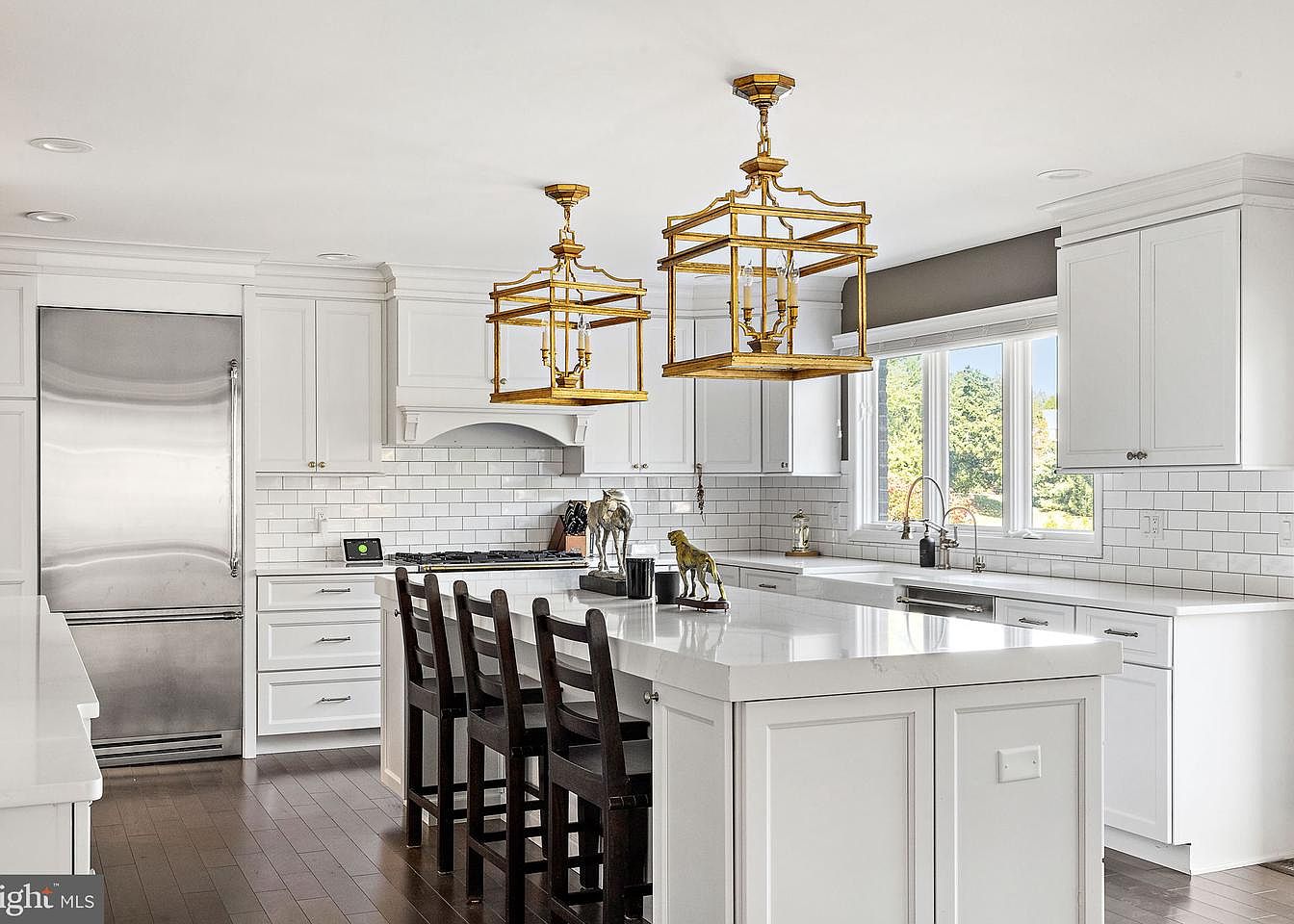 The kitchen features a spacious layout with white cabinetry offering a clean feel. Modern stainless-steel appliances, including a large refrigerator, seamlessly blend into the design. Subway tiles in a glossy white create a backsplash that adds texture above the gas range. A generous island with a white marble countertop serves as a focal point, surrounded by dark wood bar stools, fostering a casual dining experience. Two elegant gold pendant lights hang above the island, providing warm illumination. Natural light streams in through large windows, showcasing the lush outdoor greenery, enhancing the inviting atmosphere.