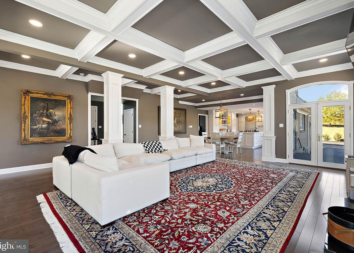A spacious living room featuring a coffered ceiling painted in a warm gray tone, accented by white beams. The room is anchored by a plush white sectional sofa and an intricately designed red area rug, which showcases floral patterns in blue and gold. A striking oil painting in a gilded frame adds a touch of elegance to the wall. Light hardwood floors complement the light and airy ambience. The open layout reveals a modern kitchen area with pendant lighting, visible through an adjacent archway. Large glass doors provide natural light and an inviting view of the outdoors.