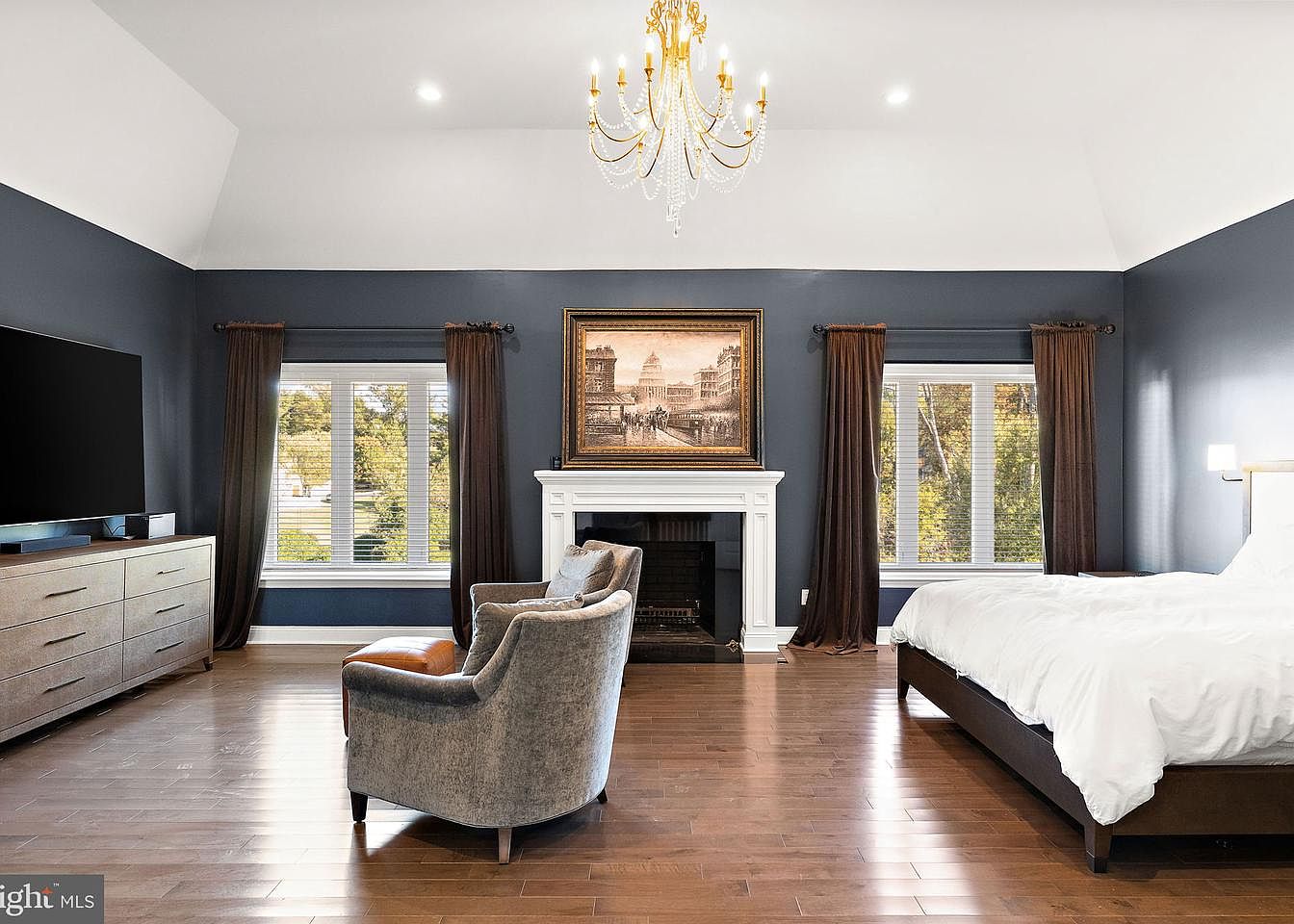 This spacious bedroom features deep blue walls complemented by rich brown curtains framing large windows, allowing natural light to flood the space. A soft, plush armchair with a brown leather accent is positioned near a modern dresser, creating a cozy reading nook. The room is anchored by a large bed with crisp white bedding, enhancing a serene atmosphere. A stylish chandelier hangs from the vaulted ceiling, adding an elegant touch. A classic fireplace, painted white, serves as a focal point, adorned with a vintage framed artwork, blending modern comfort with historical charm.