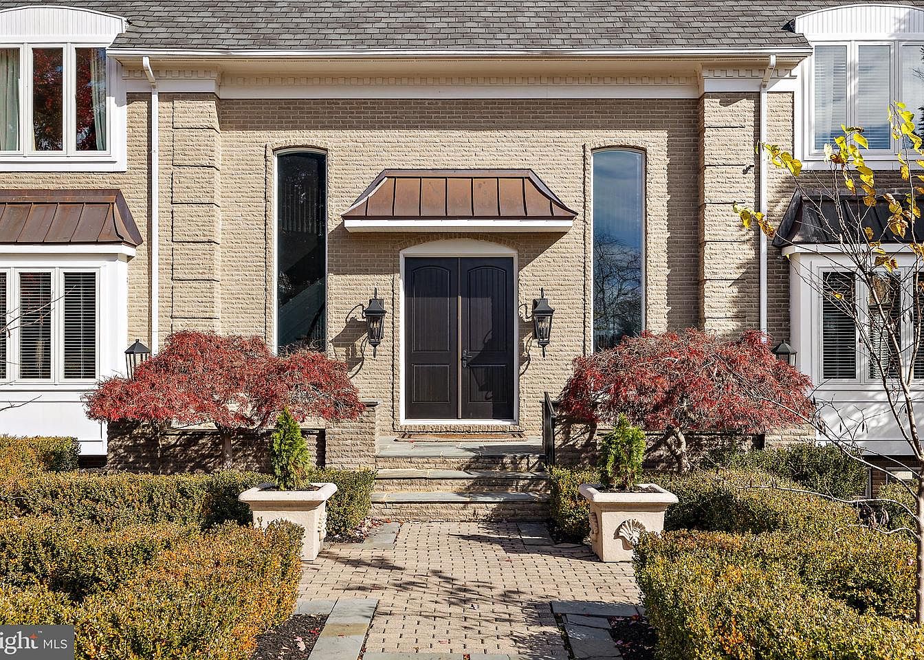 The front entrance features a striking dark wooden double door, flanked by elegant lanterns, providing a warm, inviting focal point. The facade showcases a soft beige brick texture that complements the lush greenery in the meticulously manicured garden. Colorful Japanese maples with vibrant red foliage add seasonal contrast. A slate walkway extends towards the entrance, bordered by neatly trimmed hedges and subtle, decorative planters. The architectural elements include a distinctive copper overhang, enhancing the modern yet classic aesthetic. Large windows reflect natural light, contributing to the overall spacious and welcoming atmosphere of the home.