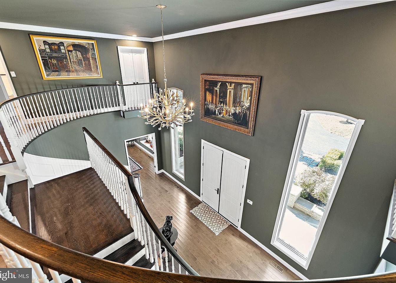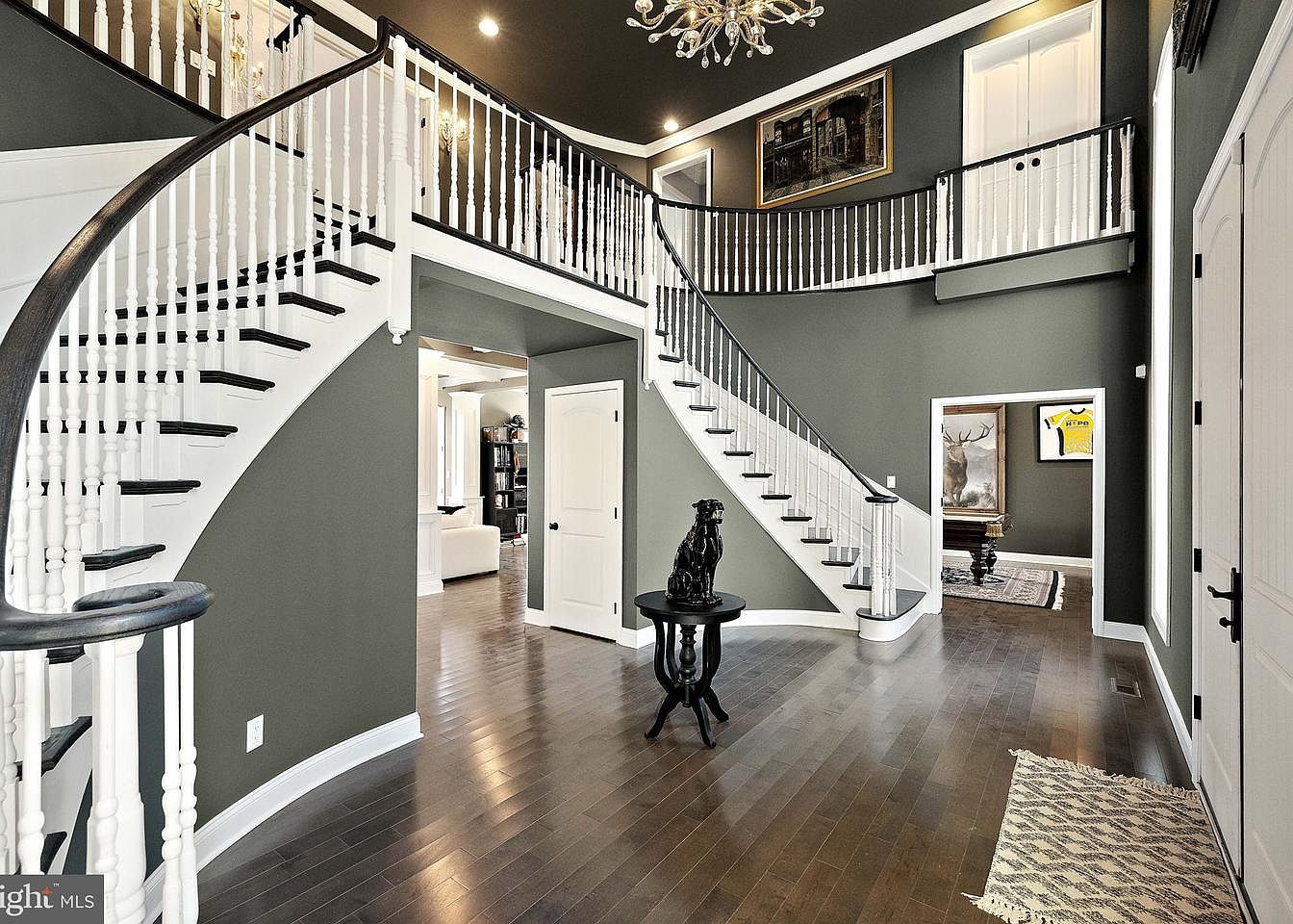 The foyer features an elegant circular staircase, its white balustrade contrasting sharply with the deep gray walls. The glossy dark wood flooring reflects soft lighting, enhancing the spacious atmosphere. A small round table, topped with a black sculpture of a dog, anchors the entryway. The walls display a mix of artwork, adding a modern touch to the classic architectural style. Doorways lead off into adjoining rooms, while large windows allow natural light to flood the space. The ceiling is accented with a distinctive chandelier, further elevating the sense of sophistication in this welcoming entrance.