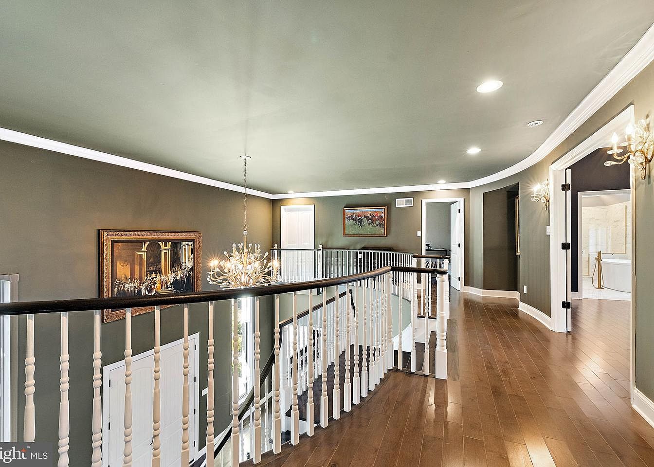 This spacious hallway features a beautiful, dark hardwood floor that contrasts with the olive green walls and ceiling, creating an inviting atmosphere. Elegant white railings lead down the staircase, adding a touch of classic design. A stunning chandelier hangs from the ceiling, providing soft illumination, while strategically placed wall sconces enhance the ambiance. Various artworks adorn the walls, offering a glimpse into the home’s character; one prominent painting is framed, depicting a lively scene. Smart architectural details such as curved walls and modern doors complement the historic charm, making this hallway a perfect blend of tradition and contemporary style.