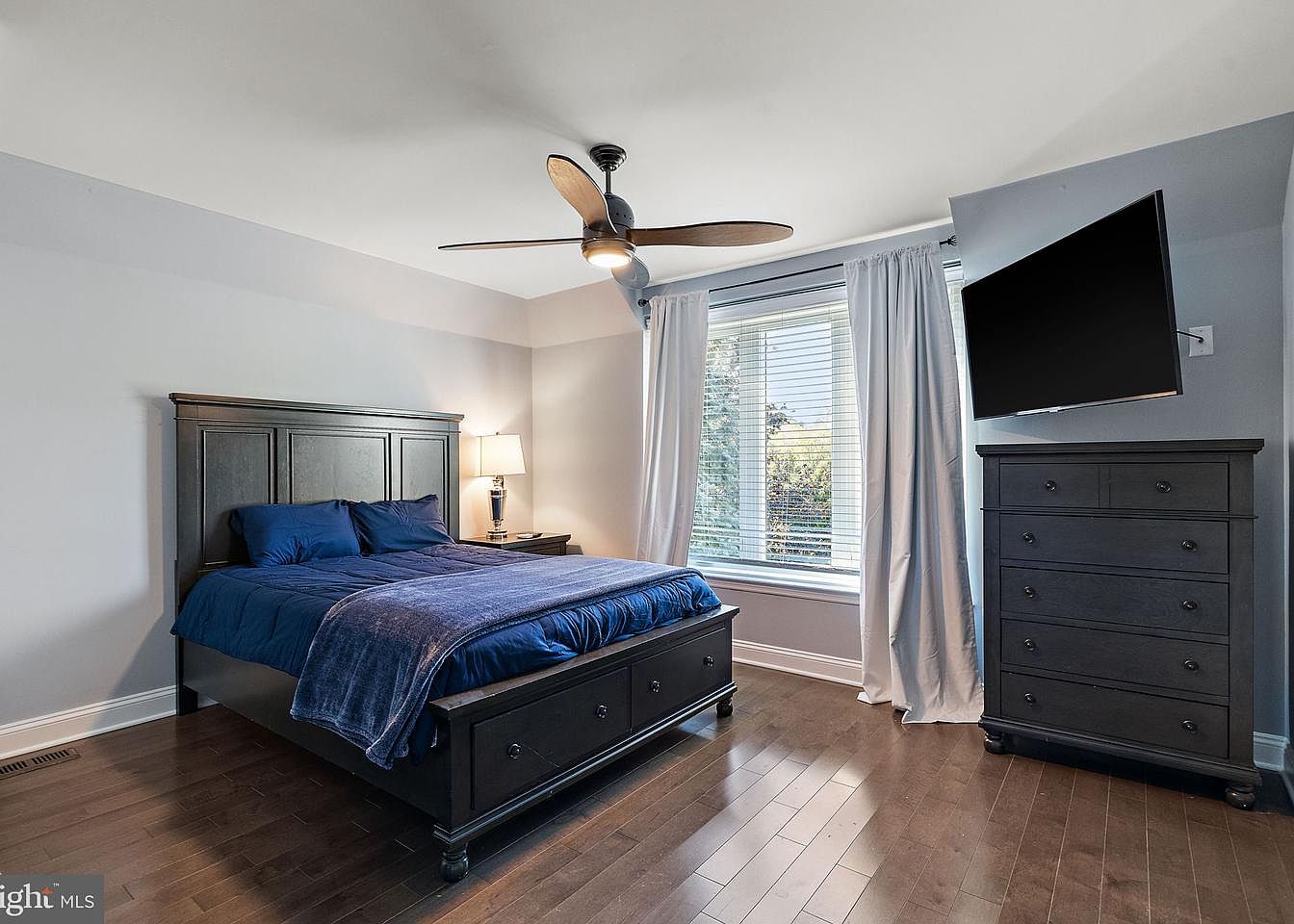 This bedroom space features a sleek, modern aesthetic with dark wood furniture, including a prominent bed with a high headboard and matching nightstand. The bedding showcases a rich navy blue color, complemented by a soft throw blanket at the foot. A contemporary ceiling fan with wooden blades adds a stylish touch above. Natural light floods in through a large window dressed with white curtains, illuminating the warm, polished hardwood floor. A flat-screen TV is mounted on the wall opposite the bed, ensuring convenience. Overall, the room strikes a balance between comfort and a minimalist, sophisticated design.