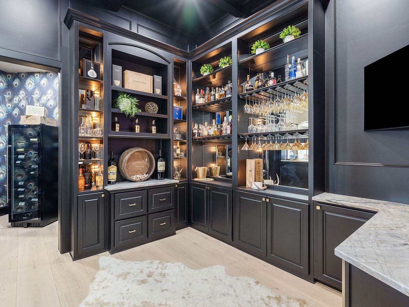 A sophisticated home bar area features elegant dark cabinetry with gold hardware, open shelving, and mirrored backsplashes to enhance the sense of space and light. Wine and spirits are neatly arranged alongside decorative plants, creating a welcoming yet refined atmosphere. Glass racks above the countertop hold stemware for effortless entertaining. The marble countertop provides a durable and stylish workspace, while undercounter cabinets offer abundant storage for family needs. Light wood floors brighten the room and complement the dark cabinetry, while a cowhide rug adds warmth and texture to the overall design. The adjacent wine fridge emphasizes family-friendly entertaining and organization.