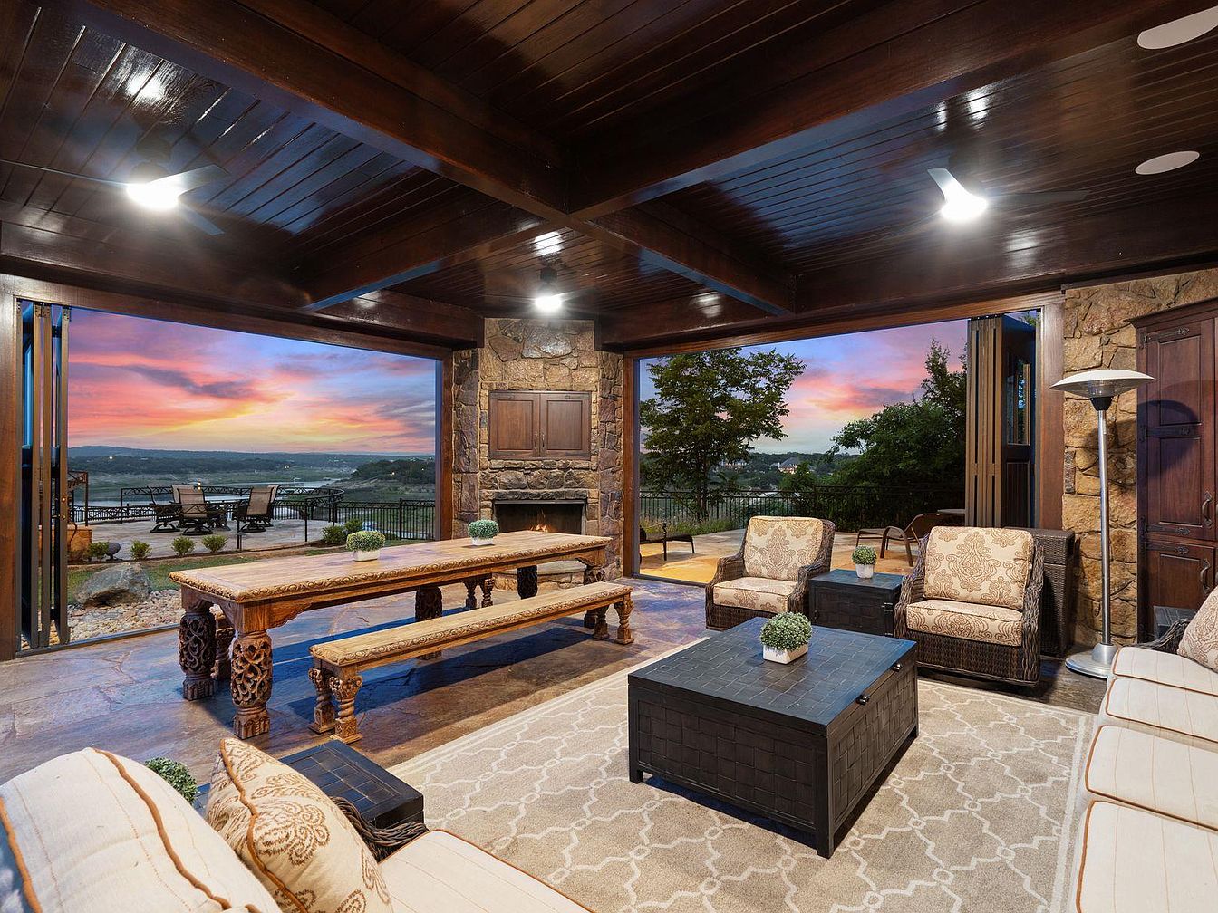 Spacious covered patio offers breathtaking panoramic views of the landscape and lake at sunset, perfect for family relaxation or entertaining. This inviting outdoor living area features elegant dark wood beams and ceiling, a rustic stone fireplace, and expansive open walls that seamlessly blend indoor comfort with outdoor beauty. Plush cushioned seating surrounds two sturdy square tables, while a long carved wooden dining table with benches is ready for family meals. Soft neutral tones and intricate patterned upholstery add warmth, complemented by a large patterned rug for cozy gatherings. Safety railing, generous space, and comfortable furnishings make it ideal for families.