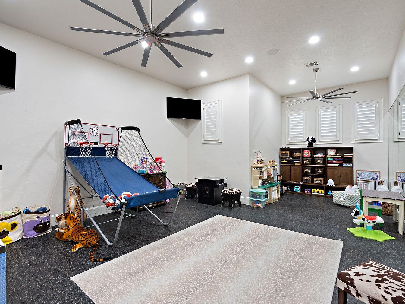 Bright and spacious children’s playroom featuring soft white walls, recessed lighting, and two large modern ceiling fans providing a comfortable environment for active play. The room is furnished with a basketball arcade game, plush animal toys, and bins for organized storage of smaller items. Wall shelving and cubbies store books, games, and toys, promoting tidy organization. Multiple tables and a kitchen play set encourage imaginative play and creativity. The soft area rug in the center provides a cozy surface for sitting or crawling, while large shuttered windows fill the room with natural light. This cheerful design creates a safe, engaging, and family-friendly space for kids.