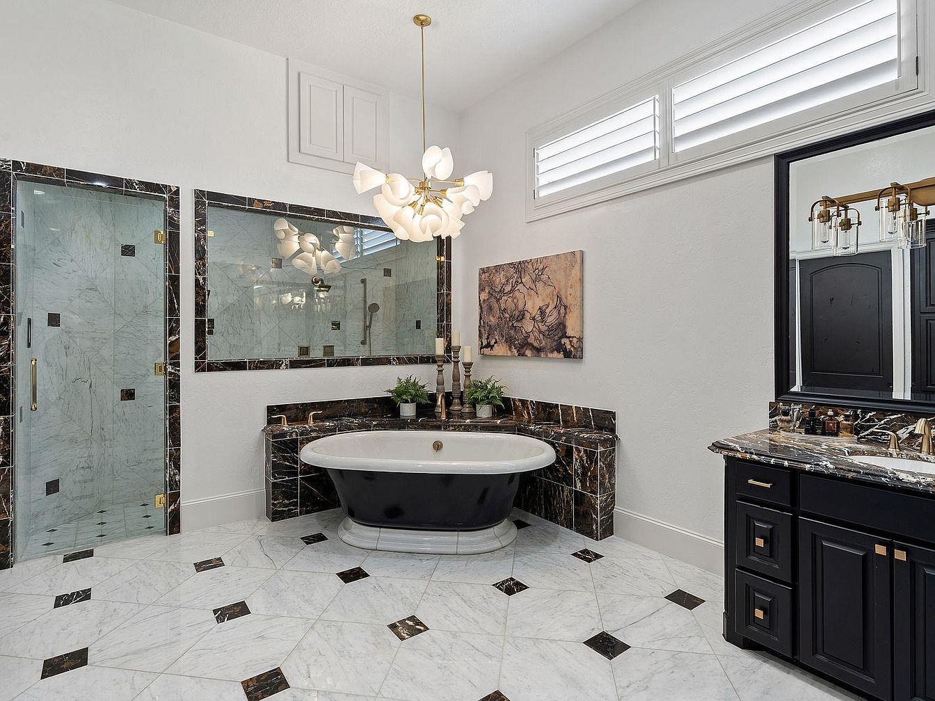 A spacious luxury bathroom features a freestanding black and white soaking tub set against a marble accent wall. The elegant walk-in glass shower, framed by striking dark marble, adds a sophisticated touch. Polished white marble flooring with dark geometric inlays enhances the room’s modern aesthetic. Ample natural light pours in from high horizontal windows with white shutters, creating a welcoming and relaxing environment for families. Dark wood cabinetry and matching marble countertops offer practical storage space, while decorative plants and stylish artwork provide a cozy, homely feel. A statement chandelier and double vanities complete the harmonious, family-friendly design.