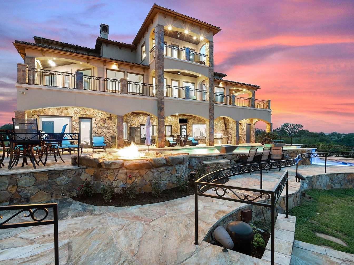 A spacious multilevel outdoor patio extends from the back of a large American home, ideal for family gatherings and relaxation. The patio features natural stone flooring and sturdy wrought-iron railings for safety, ensuring children can play securely. Comfortable blue cushioned seating and multiple dining sets provide ample areas for both adults and kids to lounge or have meals together. An inviting round fire pit serves as a focal point, perfect for evening conversations. Large stone pillars support the balconies above, while soft recessed lighting adds warmth. Lush landscaping and a view of green fields complete this tranquil setting against a vibrant sunset sky.