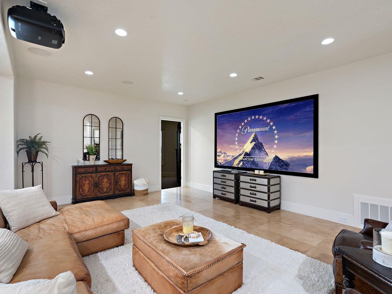 A spacious, family-friendly home theater room featuring a large, wall-mounted projection screen as the focal point. The space is designed for comfort, with a plush, tan sectional sofa and matching ottoman centered on a soft white area rug, ideal for relaxing or gathering with family. Neutral walls and recessed lighting create a bright and inviting feel. The room features a classic wooden sideboard with intricate detailing topped with plants and decorative items, bringing warmth and character. Decorative mirrors above the sideboard reflect light, enhancing the airy ambiance. The setup is perfect for movie nights and family entertainment.
