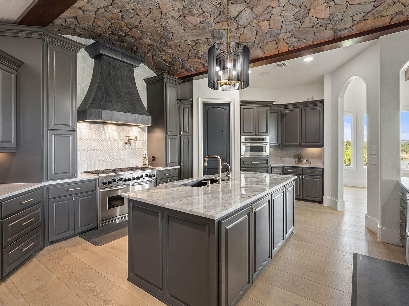 Spacious kitchen featuring a large marble-topped island at the center, ideal for family gatherings and meal prep. Soft gray cabinetry lines the walls, accented with gold hardware for a modern yet timeless feel. The focal point is a dramatic stove area with a decorative patterned tile backsplash and a substantial vent hood. The ceiling is uniquely finished with stone, adding rustic charm and texture, and a contemporary pendant light hangs above the island. Light wood floors create a warm, inviting atmosphere, while an open layout and plenty of natural light from adjacent windows make this space perfect for family living.