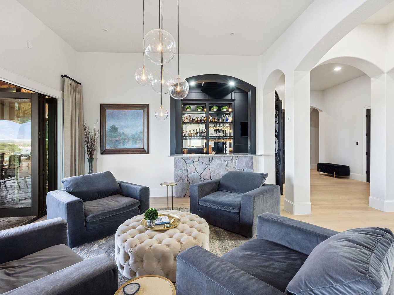A spacious open-plan lounge showcases four plush, deep-cushioned gray armchairs arranged in a cozy circle around a tufted, round ottoman, perfect for family gatherings or entertaining guests. The room is bathed in natural light from large sliding glass doors leading to an outdoor patio. Soft beige walls and arches create a warm, inviting atmosphere, complemented by modern pendant lights with clear globes that hang centrally above the seating. A stylish stone-accented bar stands against the far wall with shelves of glassware, adding a refined touch for adult gatherings while maintaining sightlines for parents. Neutral tones and soft textures ensure comfort and a family-friendly vibe.
