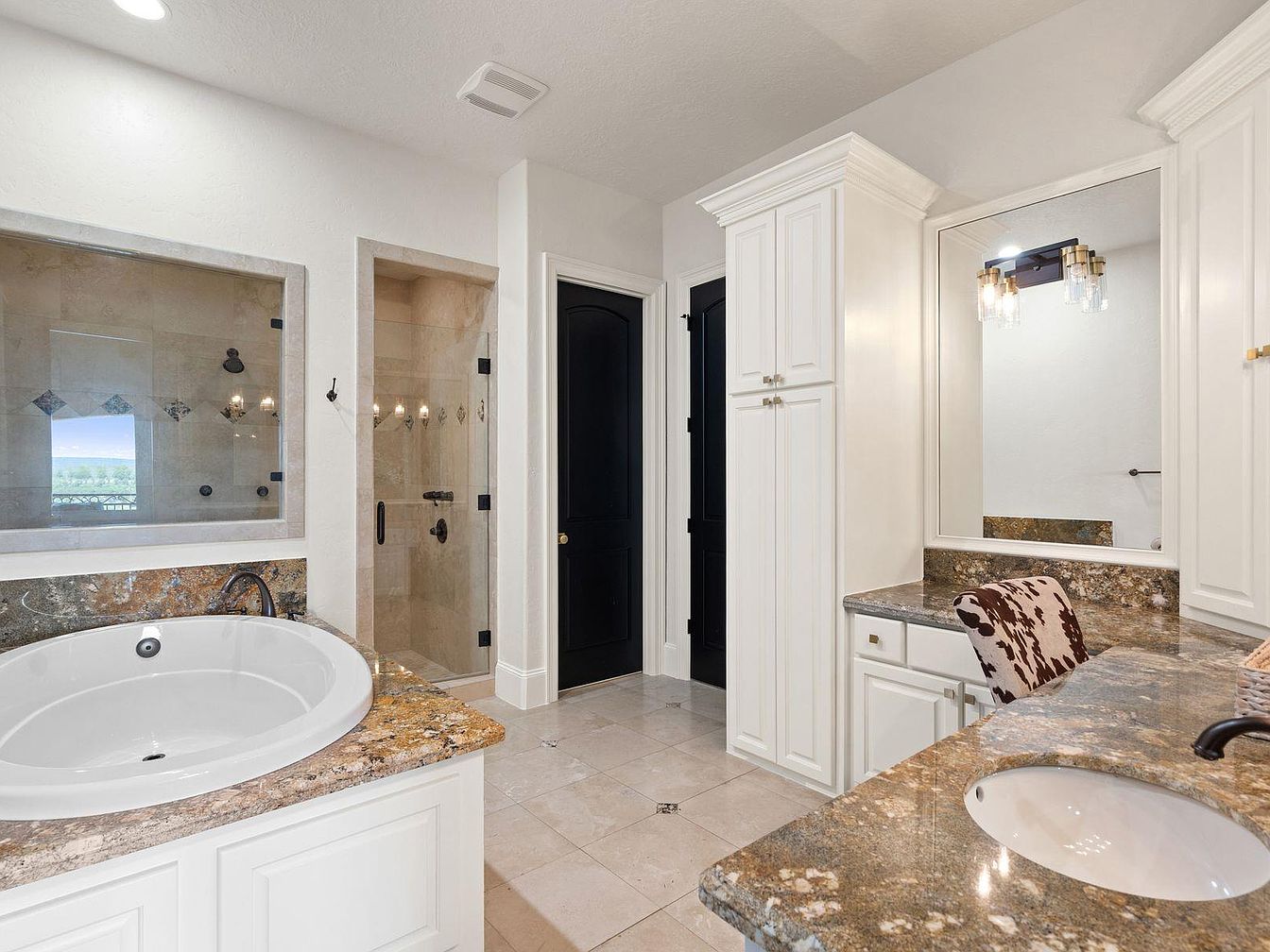 This spacious family bathroom features a luxurious soaking tub set into polished granite counters, complemented by a matching granite vanity with dual sinks, allowing multiple family members to use the space comfortably. Creamy white cabinets line the walls, offering plentiful storage for toiletries and towels. A glass-enclosed walk-in shower features elegant tile detailing and oil-rubbed bronze fixtures for a touch of sophistication. The large wall mirror above the counter enhances the sense of space and light, while a cushioned chair with a playful cowhide pattern adds both style and comfort. Light, neutral tones throughout make the space welcoming and easy to keep clean.