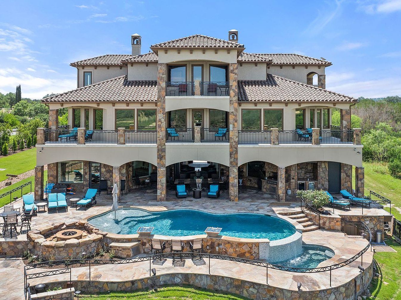 Expansive stone patio featuring a sparkling swimming pool and integrated spa takes center stage, surrounded by a tiered layout of outdoor seating areas ideal for family gatherings. The Mediterranean-style home’s exterior showcases stucco walls, arched stone columns, and multiple balconies with black metal railings, all beneath classic terracotta roof tiles. Ample lounge chairs with bright blue cushions, shaded seating nooks, and a built-in fire pit offer a variety of spaces for relaxation and play. Manicured lawns, lush greenery, and gentle rolling hills frame the property, creating a safe, secluded, and scenic environment perfect for children to explore.