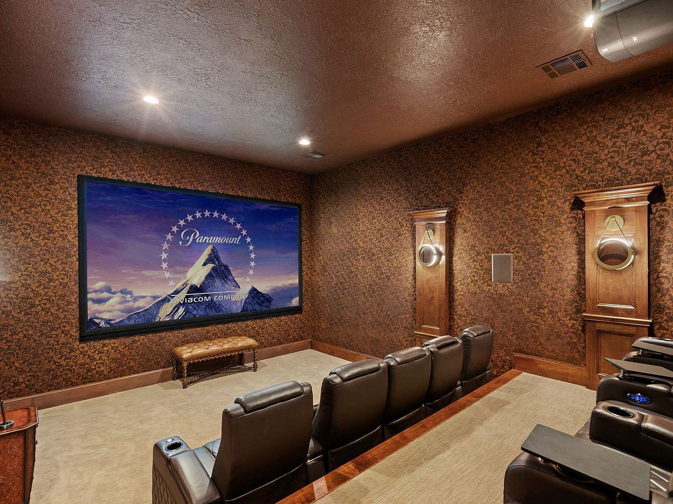 This customized home theater room is designed with family entertainment in mind, featuring a large projection screen framed by richly patterned brown wallpaper and elegant wood paneling accents. The space offers plush, black leather recliner seating set in two straight rows, complete with built-in cup holders and tray tables for snacks. Luxurious touches include tufted leather benches at the front and sophisticated circular wall sconces that softly illuminate the room. The warm, earthy color palette creates a cozy and inviting atmosphere, while the spacious layout ensures that everyone in the family can enjoy comfortable group movie nights together.