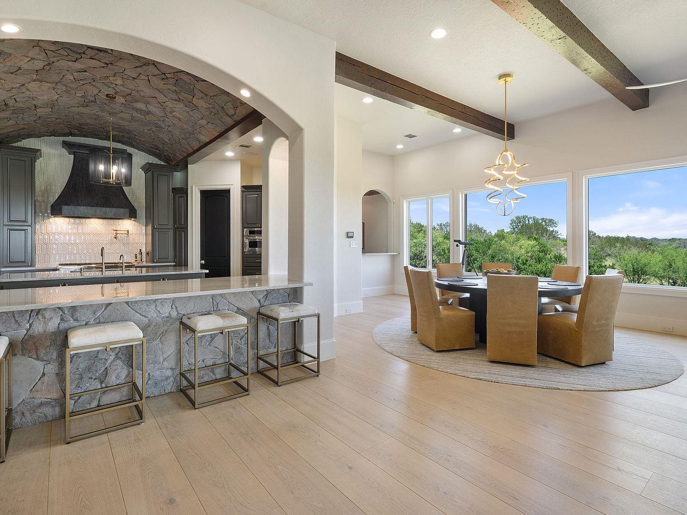 Spacious open-concept kitchen and dining area designed for comfortable family living. The kitchen features a striking stone archway ceiling and matching stone island with plush, upholstered bar stools, ideal for casual breakfasts or after-school snacks. Dark cabinetry pairs beautifully with a modern backsplash and statement range hood, blending elegance and function. The adjacent dining space is framed by large panoramic windows offering expansive scenic views and ample sunlight, while six tan upholstered chairs surround a round dark table on a neutral rug. Exposed wooden ceiling beams and a sculptural pendant light add warmth and architectural interest, perfect for shared family meals and gatherings.