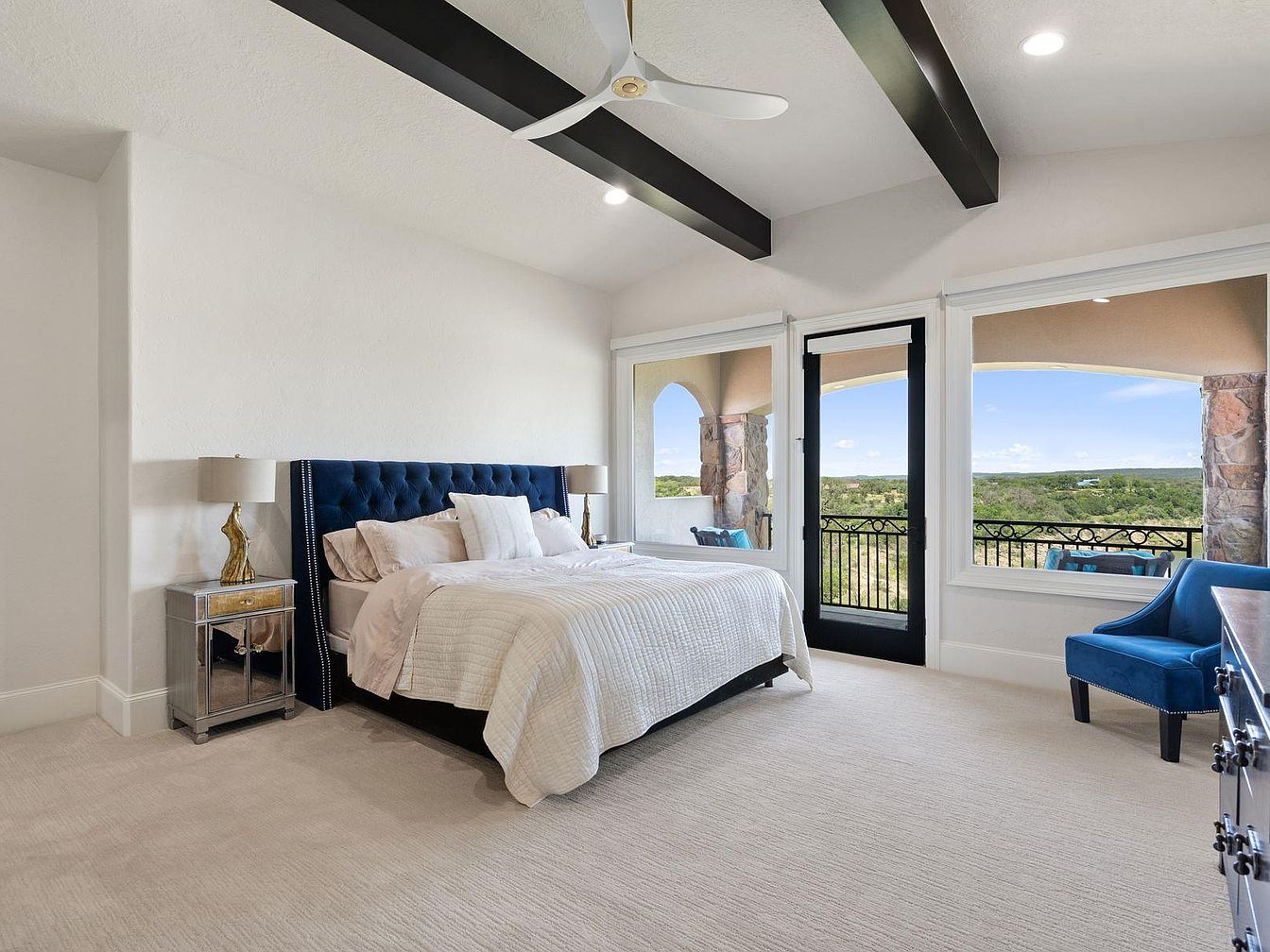 A spacious master bedroom filled with natural light from expansive windows and a glass door that opens onto a balcony overlooking scenic greenery. The room features a plush deep blue tufted headboard, flanked by mirrored nightstands and elegant metallic lamps. Soft, neutral-toned carpeting and crisp white walls enhance the bright, relaxing atmosphere. Exposed black ceiling beams add architectural interest above, while a sleek ceiling fan offers comfort. A blue accent chair provides additional seating, perfect for reading or relaxing with family. The airy layout and accessible outdoor space make this bedroom ideal for both parents and children seeking comfort and tranquility.