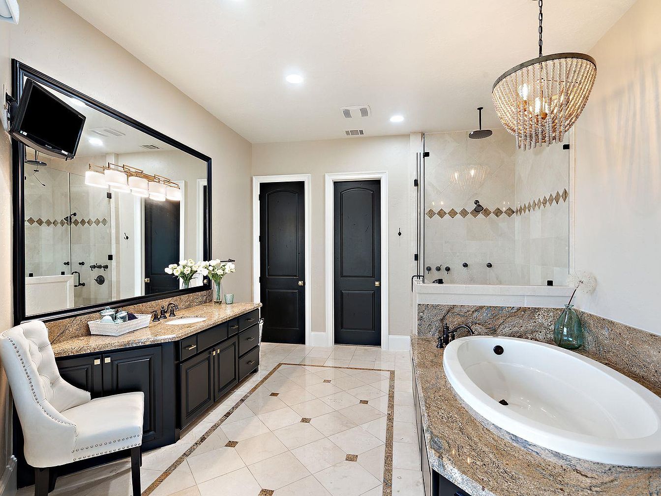 A spacious, elegant bathroom features dual vanities with dark cabinetry, granite countertops, and a large framed mirror above. A plush white upholstered chair offers comfortable seating at the vanity, while fresh white flowers in a vase add a family-friendly, inviting touch. The centerpiece is a large soaking tub set into a granite surround, accompanied by a glass-enclosed walk-in shower with stone tile accents. Warm lighting from a modern chandelier and contemporary sconces creates a relaxing atmosphere. Beige tiled floors with accent squares complement the light neutral walls, and the two black paneled doors and modern fixtures bring sophistication and style to the room.