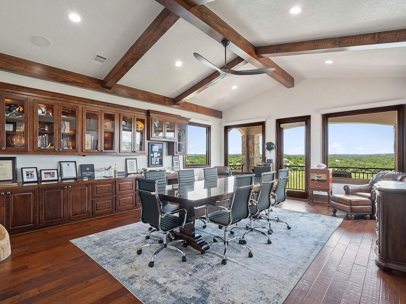 A spacious, sunlit home office features a long rectangular table surrounded by comfortable black leather swivel chairs, ideal for family discussions or collaborative projects. The room boasts warm hardwood floors and large wooden ceiling beams, adding a rustic charm balanced by modern touches. Built-in glass-front cabinets display family awards and memorabilia, creating a sense of pride and achievement. Floor-to-ceiling windows frame sweeping views of green hills, allowing natural light to fill the space. An inviting leather armchair in the corner provides a cozy reading nook. The neutral color palette of browns, creams, and blues encourages both productivity and relaxation, making it perfect for family use.