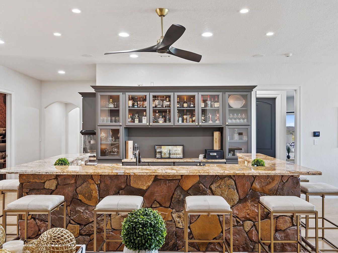 An inviting home bar area is featured at the heart of the living space, anchored by a striking stone-faced bar with a polished granite countertop. The bar is framed with five modern, cushioned stools that offer comfortable seating, ideal for casual gatherings or family celebrations. A sleek ceiling fan and recessed lighting provide both style and comfort, while the custom cabinetry in a deep gray finish brings organization and a touch of sophistication. Glass-front cabinets display glassware and bottles neatly, while minimal greenery and gold-accented decorative spheres give an elegant family-friendly flair. The surrounding white walls and open floor plan create a warm, welcoming atmosphere.
