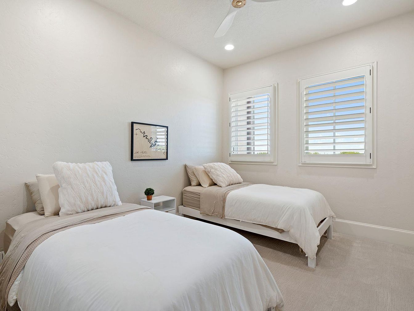 A spacious, light-filled bedroom features two single beds with plush white bedding and soft, beige throws, arranged parallel along one wall. The neutral-toned walls and carpet create a calm, inviting atmosphere, ideal for children or siblings sharing a space. Two large windows fitted with white plantation shutters allow natural sunlight to fill the room while offering privacy. A white nightstand, a simple framed map, and a small potted plant provide functional and decorative touches. Recessed ceiling lights and a sleek white ceiling fan complete the look, making this room both practical and comfortable for a growing family.