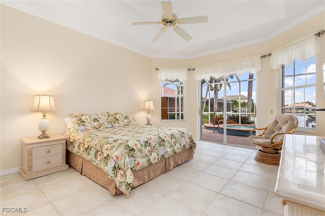 A spacious bedroom features a king-sized bed adorned with a floral patterned comforter set, matching the soft tropical ambiance of the room. Large tile flooring in a light neutral shade complements creamy beige walls. The room is illuminated by natural light streaming through three generous windows and a glass sliding door, providing a view of a backyard pool and waterfront beyond. Decorative elements include two bedside tables with traditional lamps, a light wood dresser with a matching mirror, and a cushioned chair with a round side table. A ceiling fan is centered above, enhancing the airy, relaxed feel.