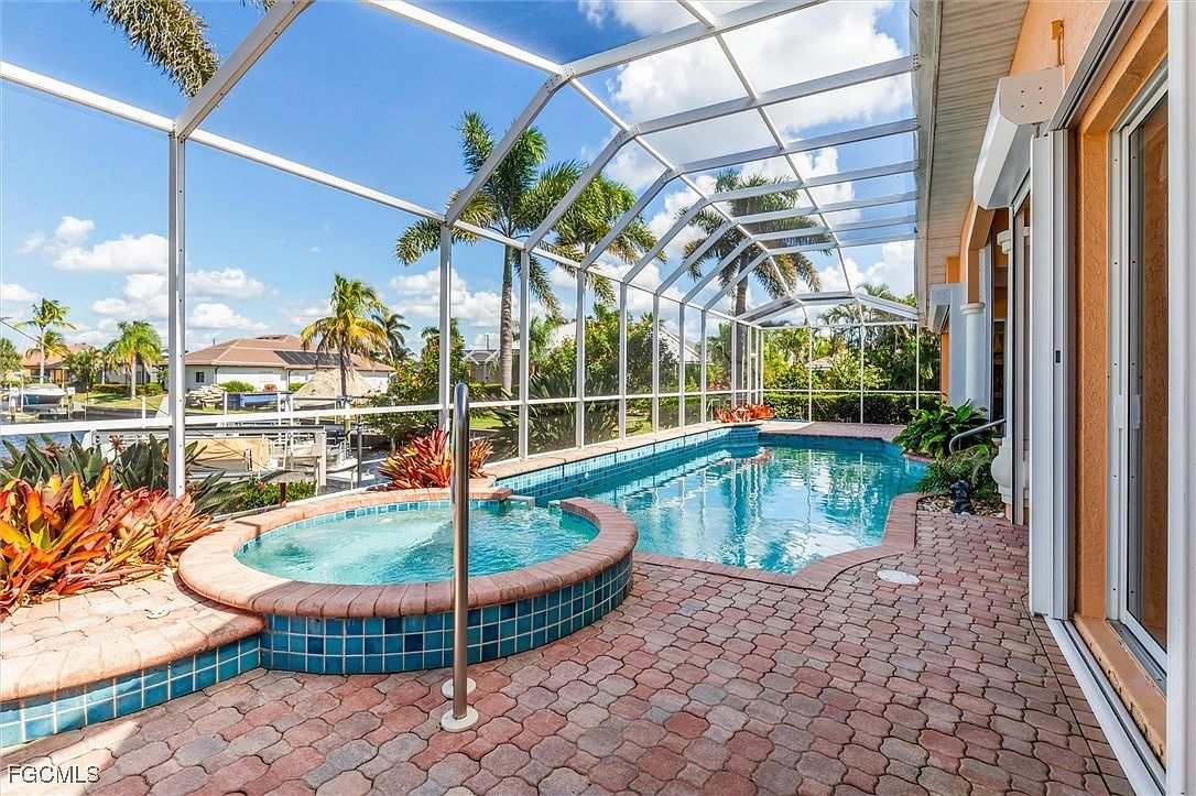 Expansive outdoor patio featuring a rectangular swimming pool and a circular hot tub, both adorned with vibrant turquoise tiles. The space is enclosed by a white screened structure that allows in abundant natural light while providing protection from insects. The brick paver floor adds warmth and texture, complementing the peach and cream stucco exterior walls of the house. Tropical landscaping with lush plants and colorful foliage borders the pool, while views of palm trees and a canal lined with boats enhance the relaxed, resort-like atmosphere of this inviting waterfront retreat.