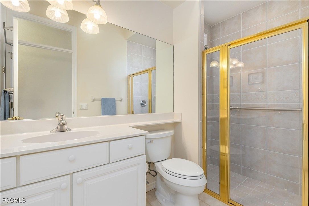 A bright bathroom features a polished white vanity with integrated sink, chrome faucet, and simple white cabinetry. Above, three globe-shaped lights hang in a row, casting a warm glow. The large mirror stretches above the vanity and toilet, visually expanding the space. To the right, a walk-in shower is enclosed with a gold-toned frame and glass door, creating a striking contrast against pale beige tile walls. The floor and shower tiles are coordinated in light, neutral hues, enhancing the clean, airy feel. A single blue towel hangs beside the frosted privacy window, completing the understated, classic aesthetic.