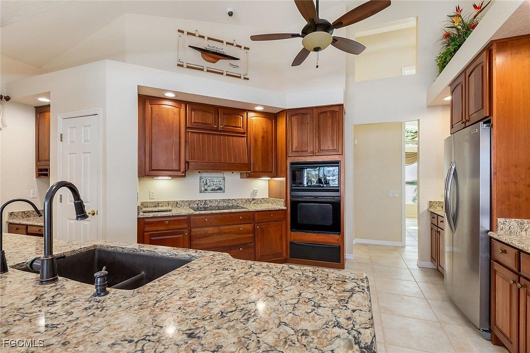 Warm wooden cabinetry with a rich, reddish-brown finish lines both sides of this spacious kitchen. Granite countertops with earthy tones complement the cabinetry, while a beige tile floor adds a neutral foundation. Recessed lighting under the upper cabinets illuminates the workspace, highlighting the textured stone surfaces. A black dishwasher and matching sink contrast with the cabinetry, and framed wall art adds a touch of personality. The layout includes an open view toward a light-filled living area, complete with a ceiling fan and decorative sailboat model. The kitchen’s overall style is inviting, traditional, and well-organized.