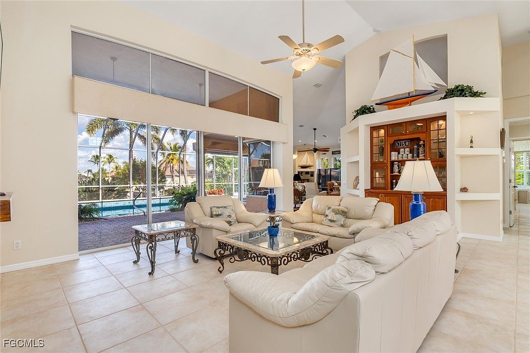 Open and airy living room with an inviting arrangement of cream leather sofas and glass-topped, ornate metal coffee and side tables. Large, floor-to-ceiling windows across one wall let in abundant natural light and provide a clear view of the pool and palm trees just outside. The soft beige walls and light tiled floors enhance the room’s brightness. Shelving units frame a warm wood built-in cabinet topped with a decorative sailboat and greenery, adding coastal charm. Blue ceramic lamps with white shades sit on either end table, and ceiling fans hang from the vaulted white ceiling for added comfort.
