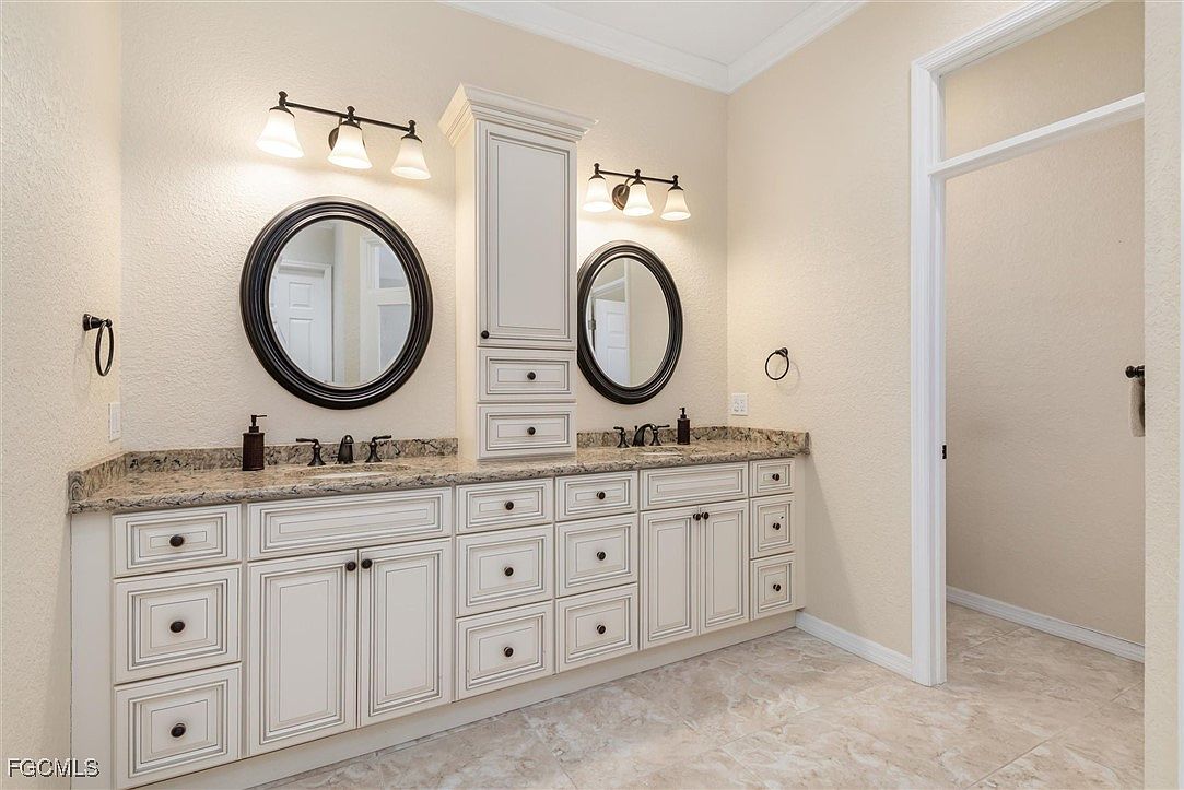 Double-sink vanity with classic cream cabinets extends along the wall, topped with speckled beige and gray granite countertops. Two round, black-framed mirrors hang above each basin, flanked by elegant three-bulb sconces providing soft illumination. A tall central cabinet adds symmetry and additional storage between the sinks. Walls are painted a warm, soft beige, complimenting the light, glossy marble-look tile flooring. Black hardware, including cabinet knobs and faucet sets, offer sophisticated contrast. The overall look is clean, inviting, and subtly refined, evoking a comfortable blend of traditional design and modern comfort.