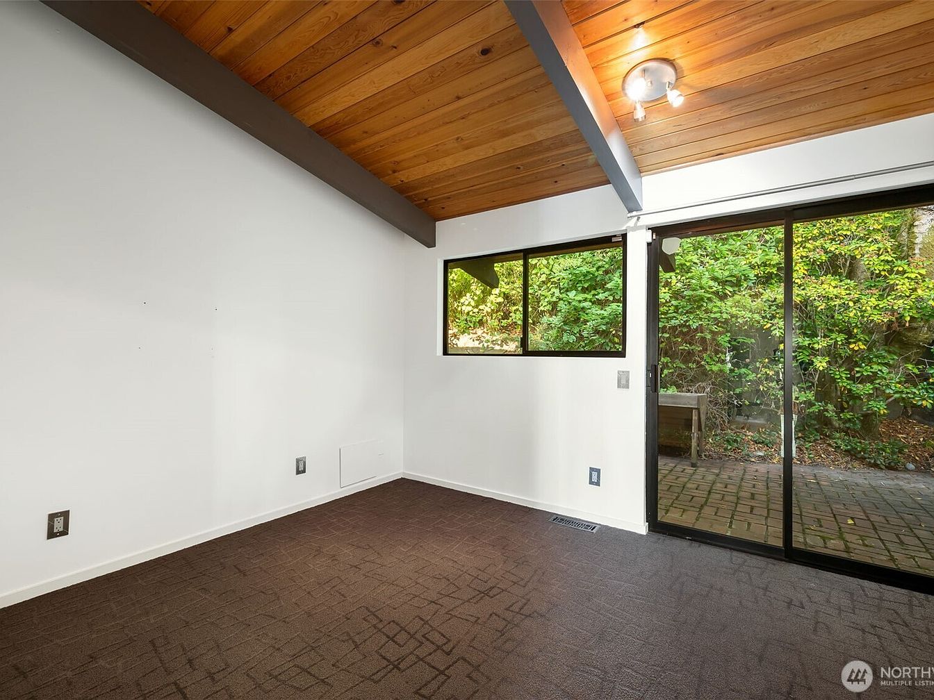 A bright and inviting room features a high, wood-paneled ceiling with exposed beams, giving a touch of natural warmth to the modern aesthetic. Large sliding glass doors and an adjacent window bring in abundant natural light and offer immediate access to a paved patio and lush, green backyard—ideal for family gatherings or children’s playtime. Clean white walls and deep brown carpeting create a simple, neutral base that makes the space feel open and versatile. The area is thoughtfully designed for both relaxation and functionality, with easy access to the outdoors making it especially family-friendly and perfect for indoor-outdoor living.