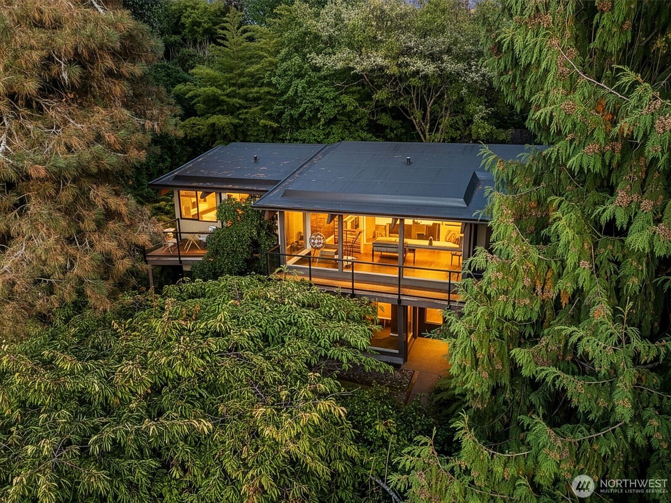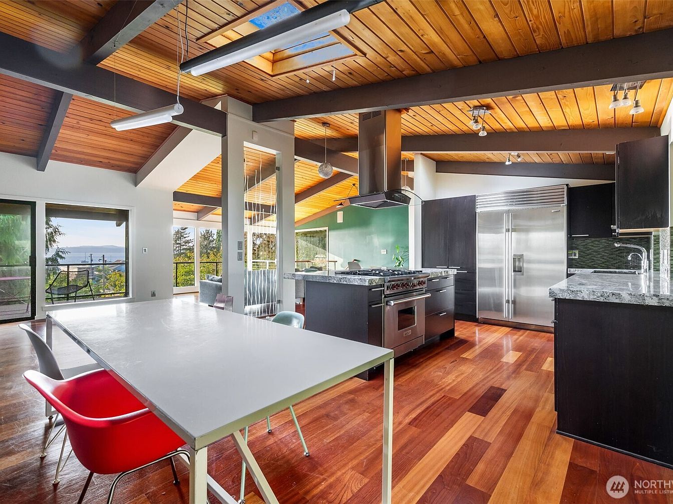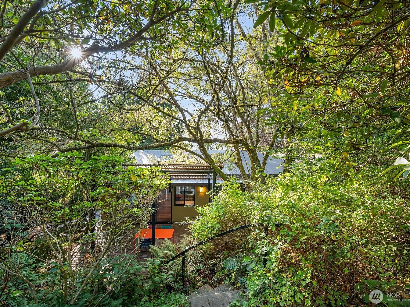 Built into the lush hillside above the Puget Sound, this mid-century modern home offers a rare glimpse into the iconic architectural style of the 1950s and 1960s, featuring cedar ceilings, expansive glass walls, and multiple decks blending indoor and outdoor living. Located on a private, quiet dead-end street in Seattle’s sought-after Alki area, it boasts spectacular views of the Sound and Olympics. Perfect for family life, the spacious living areas and terraced garden paths create a natural sanctuary ideal for entertaining and relaxation. Recently updated with an A/C system, a lifetime-warranty PVC roof, and an impressive kitchen, the 1,195,000-dollar residence welcomes further customization with available design plans. Plot size and square footage are not specified.