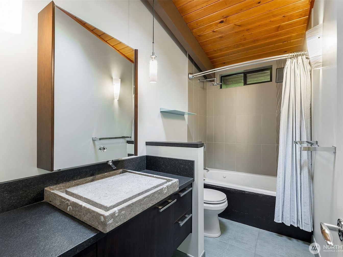 A contemporary bathroom featuring clean, simple lines and a warm, inviting atmosphere. The space includes a bathtub with a neutral-toned shower curtain, ideal for family use. The vanity has a sleek black countertop and a distinctive stone basin, complemented by modern hardware and cabinetry. Above the sink, a large mirror with wooden framing reflects light from the stylish wall sconces, adding brightness. The wooden slat ceiling brings a touch of natural warmth, contrasting nicely with the cool hues of the tile flooring and walls. Accessible fixtures and an uncluttered layout make the space practical for all ages.