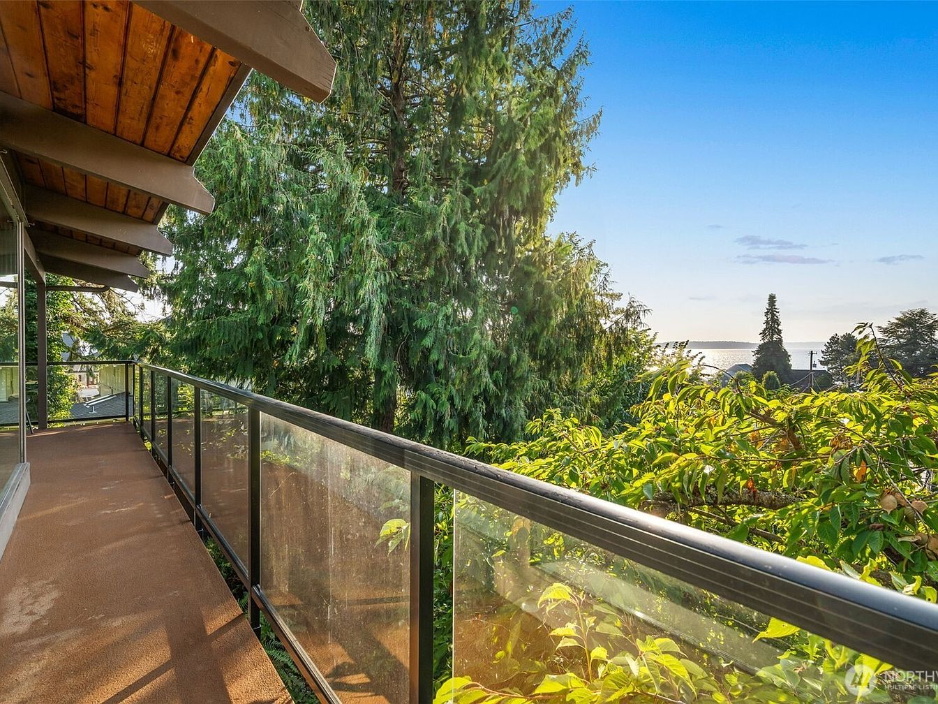 A spacious balcony stretches alongside the house, featuring a sturdy metal and glass railing that provides both safety and an unobstructed view of the surrounding nature. The balcony is partially sheltered by a wooden overhang with exposed beams finished in warm, natural wood tones, adding a rustic and inviting touch. Mature evergreen trees frame the area, while lush foliage grows below, creating a private, serene retreat for families to relax or children to play safely. Beyond the trees, glimpses of a tranquil bay and open sky promise beautiful sunsets and a calming atmosphere, enhancing the home’s family-friendly outdoor living appeal.