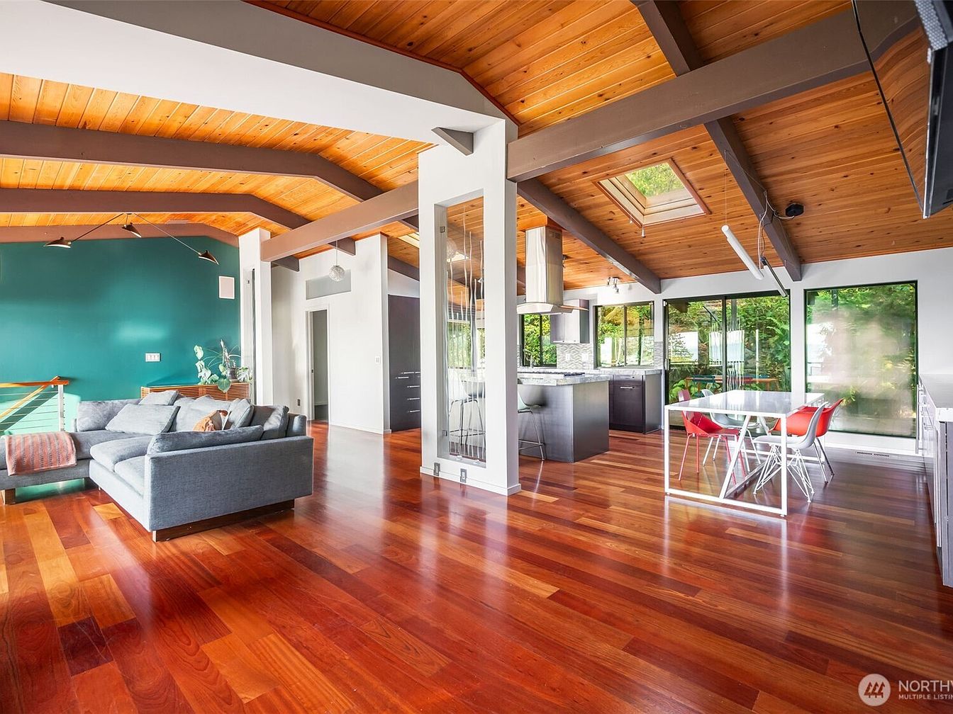 A spacious, open-concept living, dining, and kitchen area features warm reddish hardwood flooring and vaulted ceilings with exposed wooden beams stained in deep brown. The living area holds a modern gray sectional sofa accented by coordinated pillows and a textured throw, set against a teal accent wall that adds a pop of color. The dining section includes a sleek, white table paired with red chairs. Large windows flood the space with natural light and connect the indoors to greenery outside, while a skylight enhances the airy atmosphere. The layout offers an inviting, family-friendly environment with durable surfaces and ample room for gatherings and play.