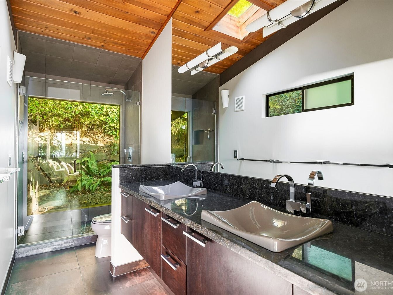 This modern bathroom features a spacious double vanity with rectangular vessel sinks mounted on elegant black granite countertops. The cabinetry below is finished in rich, dark wood tones, providing ample storage for family essentials. Natural light floods the room through a large window above the sinks and a skylight set into a warm, wooden plank ceiling, creating a bright and inviting atmosphere. The walk-in shower at the end of the room is encased in clear glass, with scenic views of lush greenery outside, offering privacy and a peaceful retreat. Sleek, chrome fixtures and wall-mounted lighting add contemporary flair.