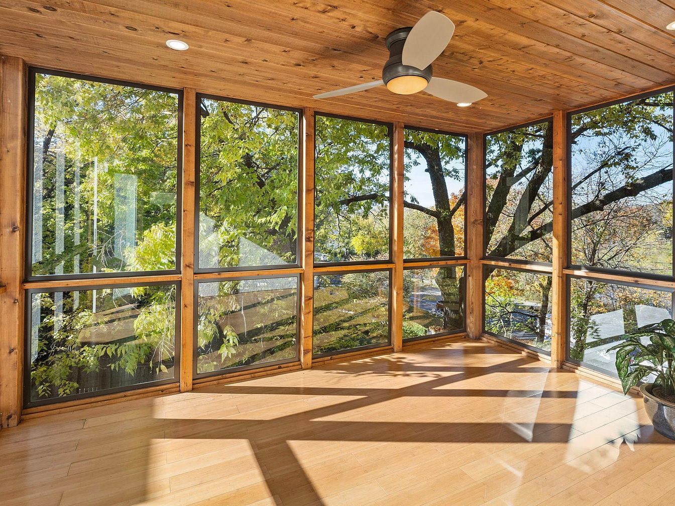 A cozy sunroom features floor-to-ceiling windows framed by warm wooden beams, allowing abundant natural light to flood the space and providing stunning views of lush green trees outside. The ceiling is also lined with smooth, knotty wood, complementing the matching wood laminate flooring. A modern ceiling fan with clean lines and a central light fixture hangs above, adding both comfort and contemporary flair. In one corner, a single green potted plant sits, its leaves catching sunlight. The inviting atmosphere is enhanced by shadows cast across the floor, blurring the boundary between indoor comfort and the natural outdoors.