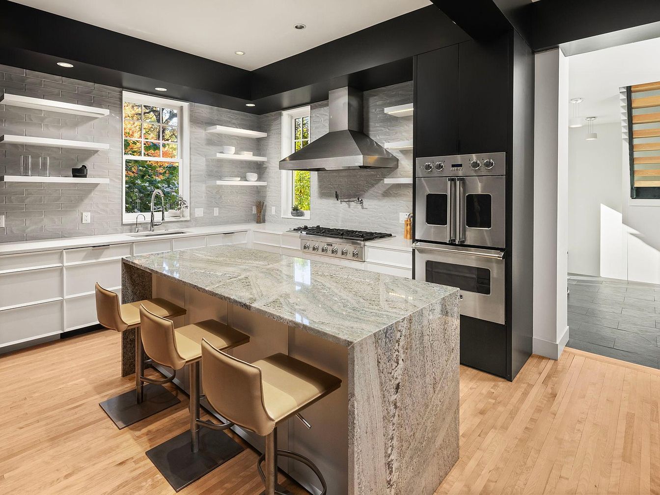 A contemporary kitchen featuring a large granite-topped island with three tan barstools, perfect for casual dining or food preparation. The floor is a light natural wood, complementing the sleek white cabinetry and open shelving that lines the walls. Gray subway tiles form the backsplash, adding subtle texture. Stainless steel appliances, including a double oven and modern range hood, contribute to the sophisticated aesthetic. Black accents on the cabinetry and ceiling beams provide contrast. Two large windows bring in ample natural light, while minimalistic decor keeps the space uncluttered and elegant.