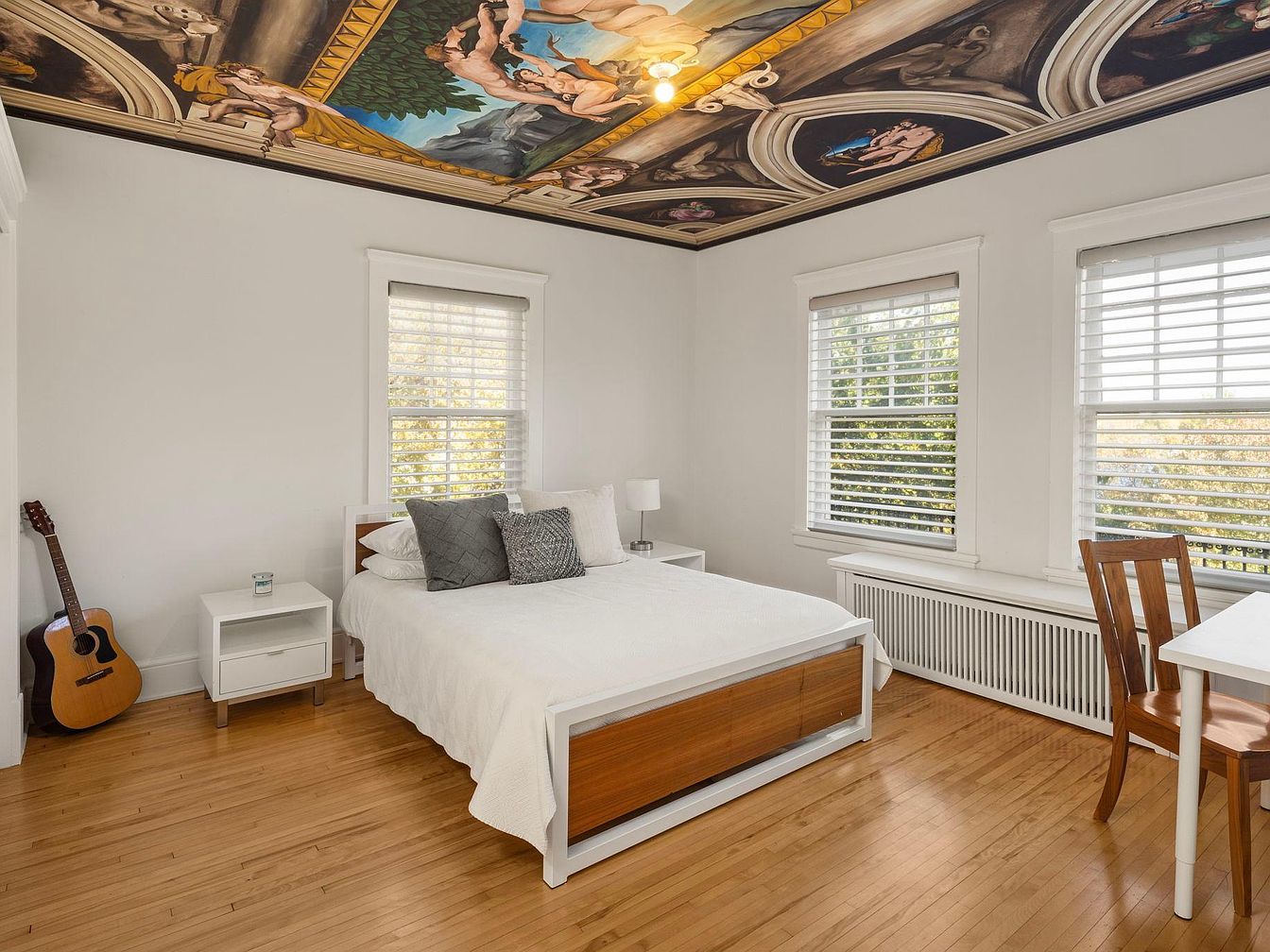This room features a simple yet elegant design with white walls and a warm, honey-toned hardwood floor. The bed has a modern frame with wooden accents and is topped with white bedding and several gray throw pillows. Matching white nightstands flank the bed, each with a minimalist lamp. Large windows with white blinds let in abundant natural light, creating an airy feel. A wooden chair and white desk provide a workspace near the window. The striking detail is the intricate ceiling mural inspired by Renaissance art, adding an unexpected grandeur and historic flair to the serene, modern bedroom.