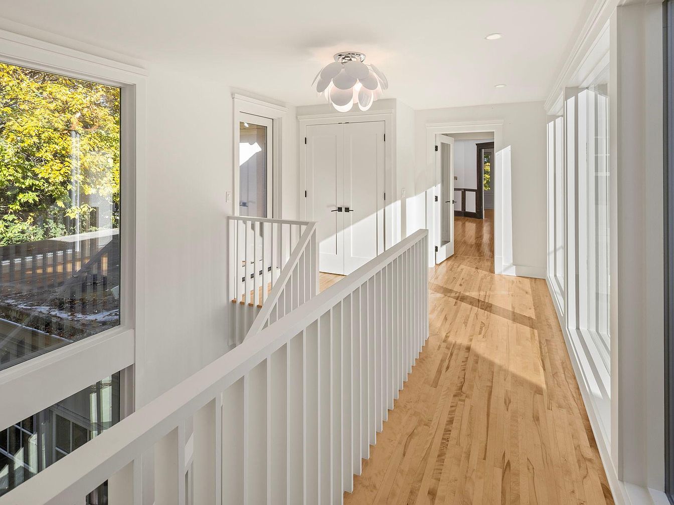 A bright, airy hallway features wide plank light wood floors and pristine white walls trimmed with simple moldings. Natural light streams in from large floor-to-ceiling windows on the right, overlooking treetops with vibrant green leaves outside. On the left, a railing encloses a staircase leading down, flanked by more large windows that enhance the open, spacious feeling. At the far end, closed double doors and a partially open single door lead to adjacent rooms. A modern, sculptural ceiling light adds a touch of contemporary flair, while the overall design emphasizes cleanliness and classic simplicity.