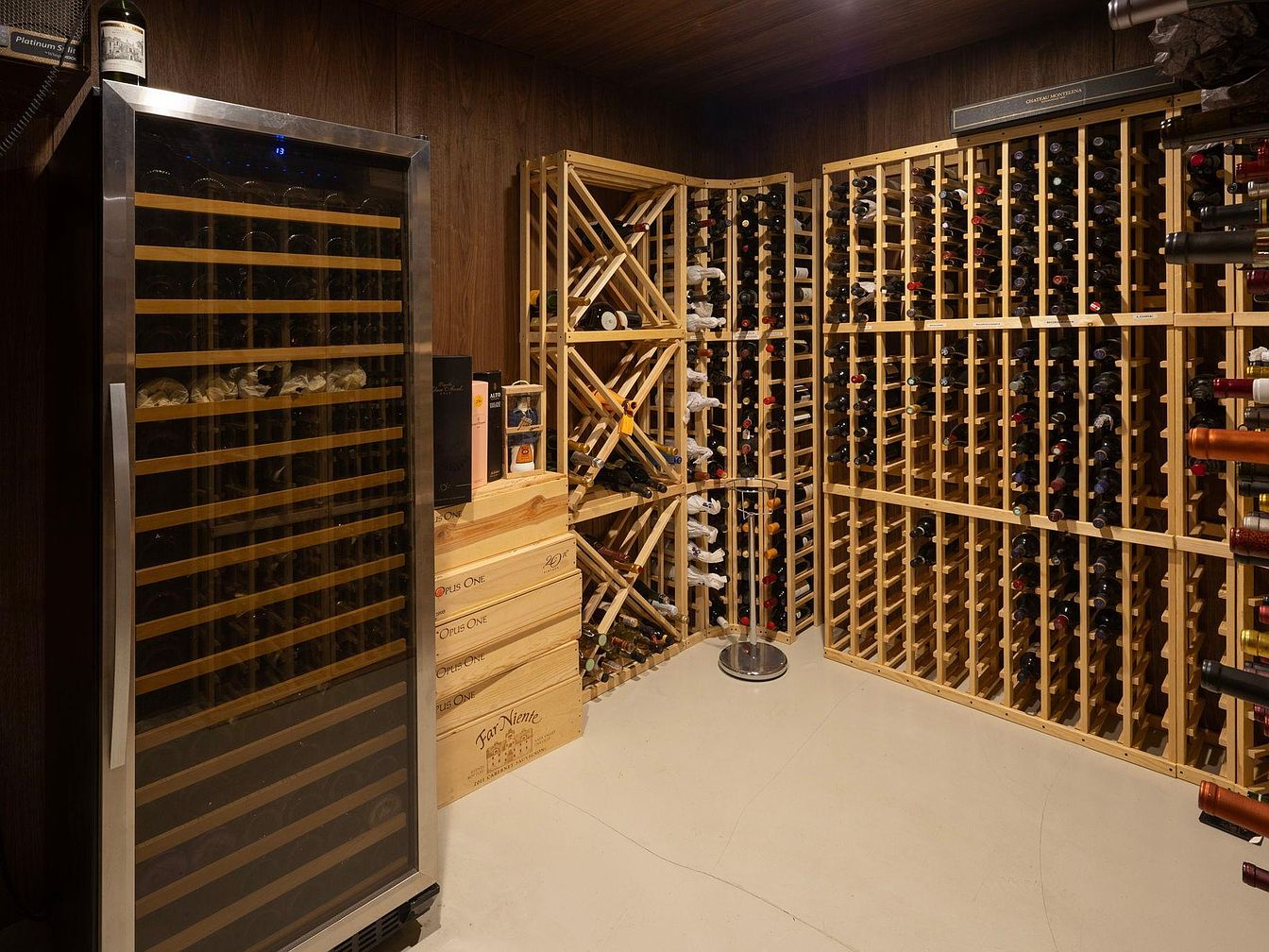A dedicated wine cellar displays a blend of traditional and modern storage solutions. A large stainless steel wine fridge stands to the left with glass doors revealing horizontal shelves filled with bottles. The back and right walls are lined with natural wood racks, organized in sections, holding hundreds of wine bottles horizontally. Light-hued wood crates are stacked on the floor for additional storage. The room features dark wood paneled walls and ceiling, giving a cozy, club-like atmosphere. The floor is a smooth, light-colored material, making space feel clean and organized, emphasizing functionality and a love for fine wine collection.