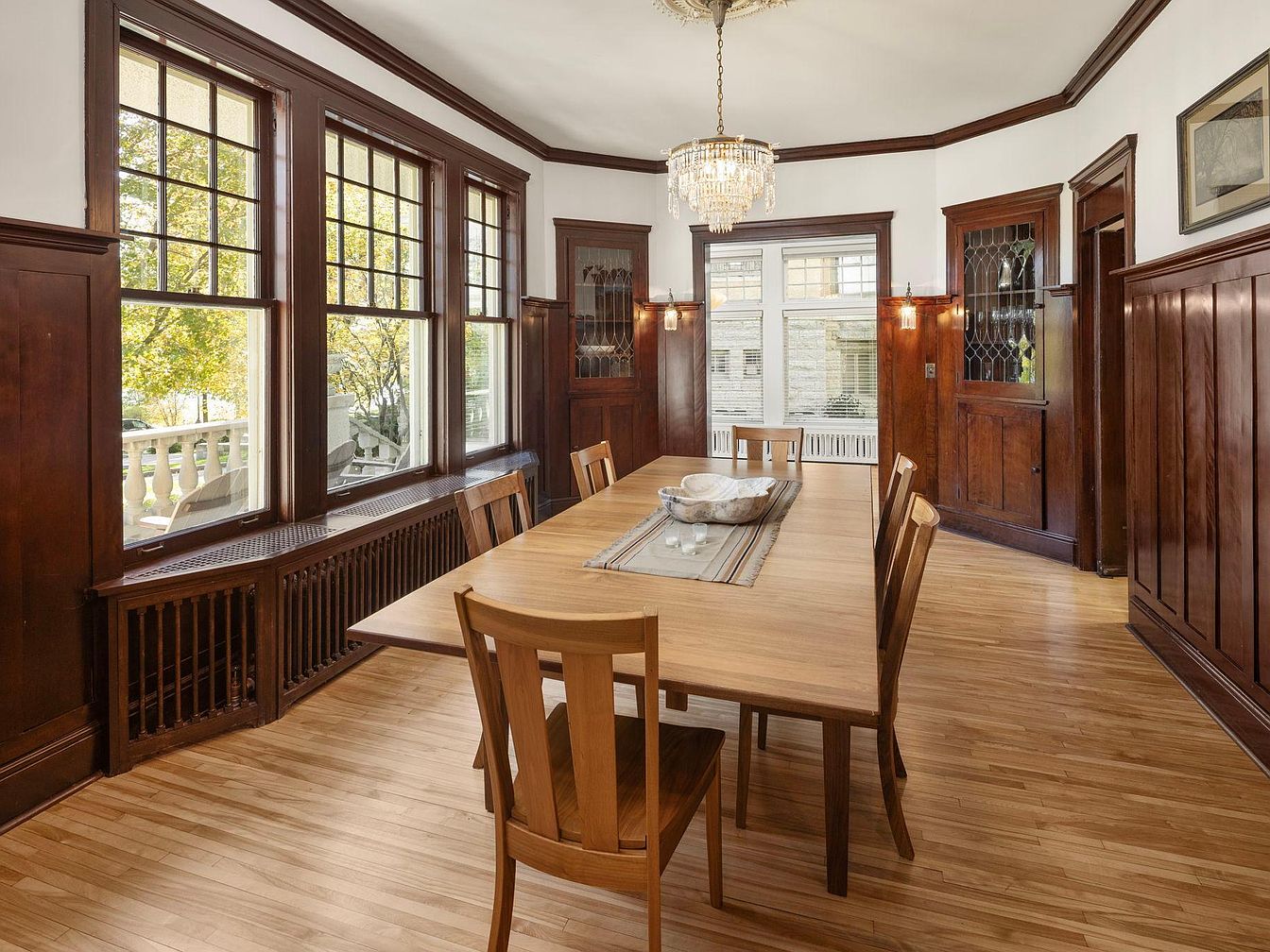 A spacious dining room featuring rich dark wood wainscoting and trim contrasted with cream-colored upper walls, creating a warm, inviting atmosphere. Large multi-pane windows let abundant natural light flood the room, illuminating the honey-colored hardwood floors. At the center, a long, rectangular wooden table is surrounded by six matching wooden chairs, topped with a decorative runner and centerpiece. Built-in glass-fronted cabinets with intricate leaded designs flank the walls, enhancing both storage and style. A classic crystal chandelier hangs above the table, and wall sconces provide additional soft lighting, highlighting the room’s historic, refined character.