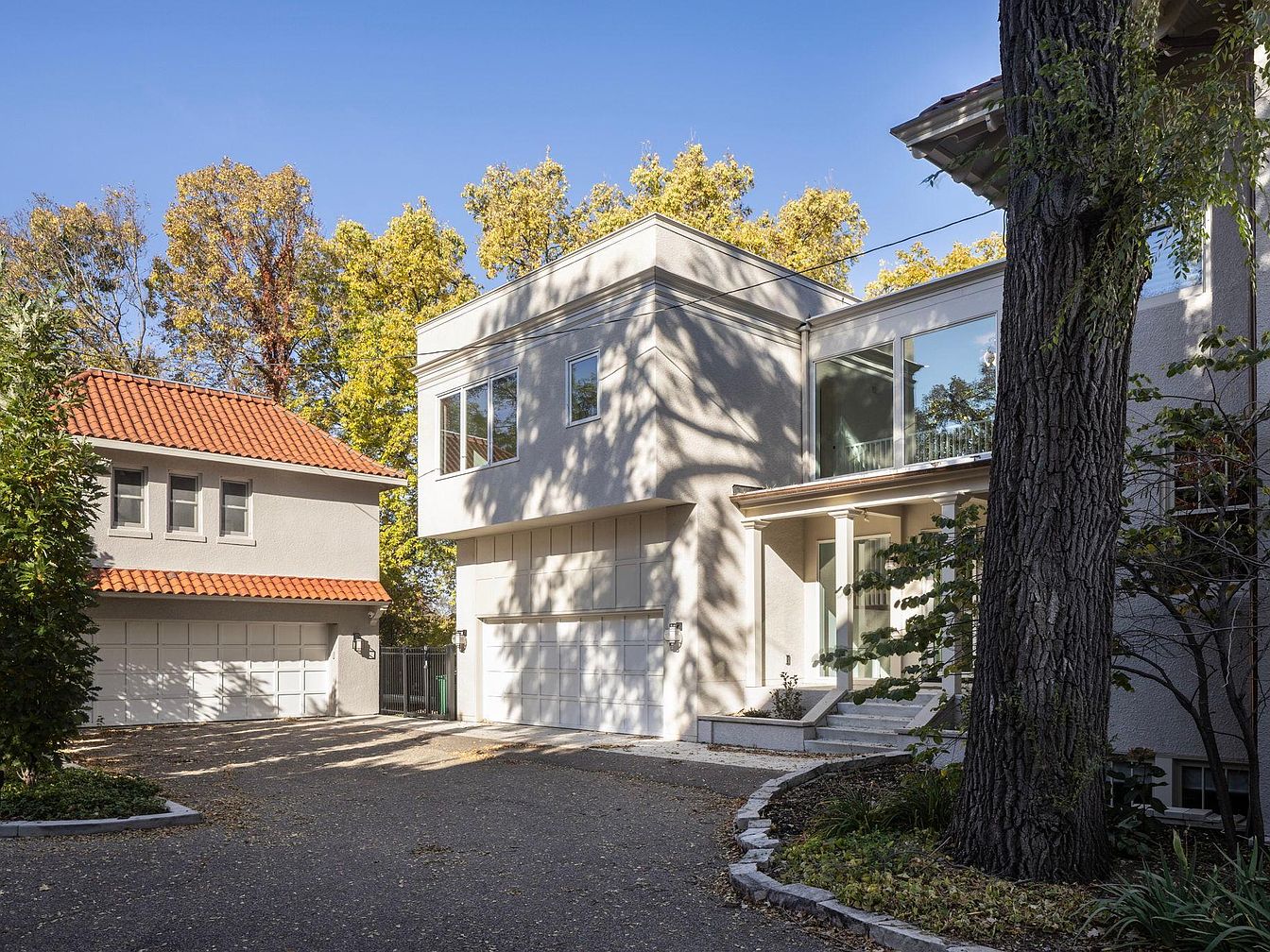 A large historic home with white stucco walls and a red-tiled roof sits nestled among mature trees in full autumn color. The house is two stories, with a modern extension featuring flat roofs and big windows, blending old and new architecture. A curving driveway approaches the front of the home, bordered by a small garden and shaded by the canopy of trees. Beyond the house, a calm lake stretches out, its blue surface reflecting the sky, with the distant city skyline visible on the horizon. The overall scene feels serene, private, and grand, showcasing beautiful landscaping.