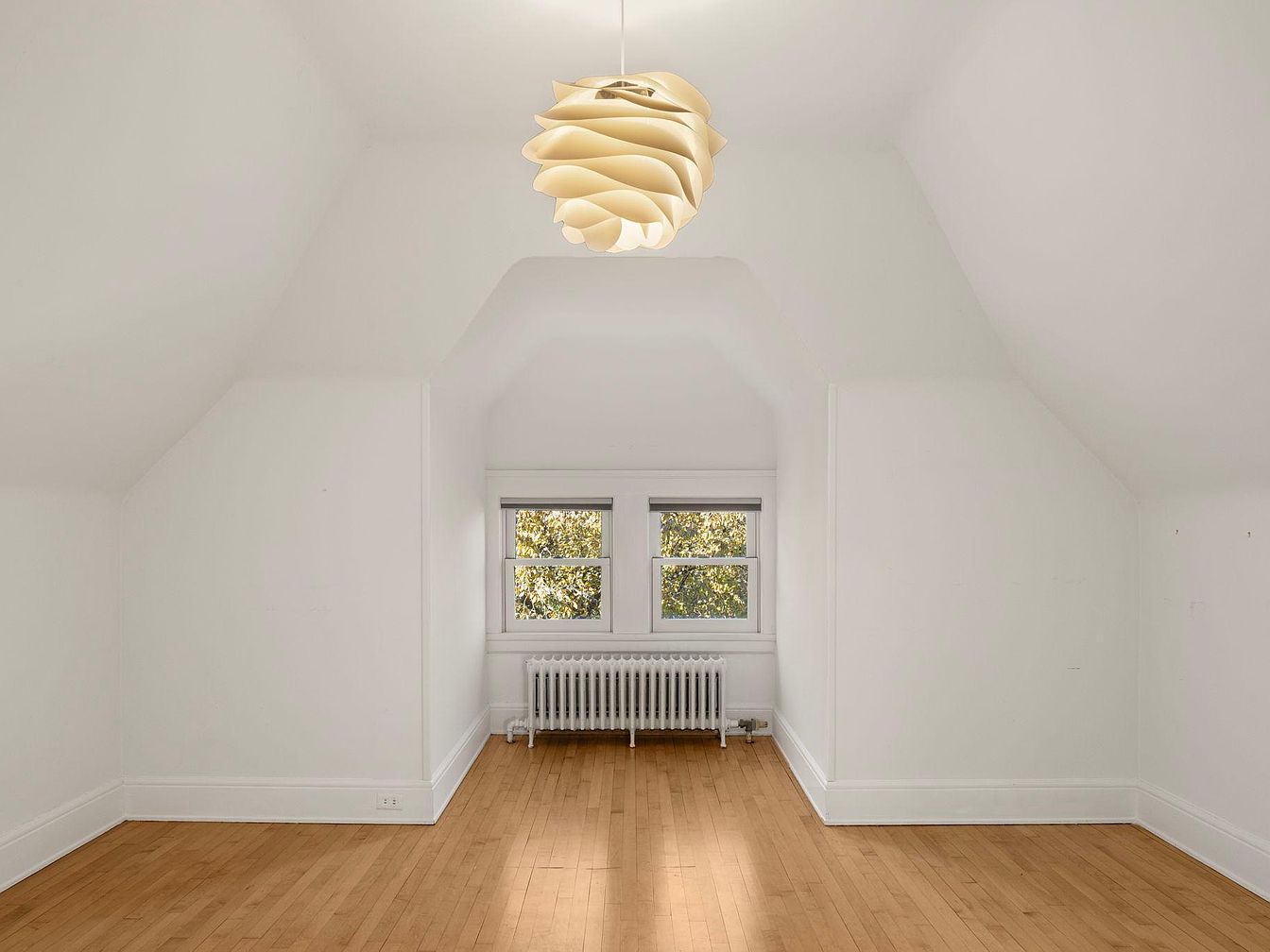 A cozy upper-floor bedroom with white walls and a gently sloped ceiling creates an airy atmosphere. Light flows in through two rectangular windows centered above a classic white radiator. Natural wood flooring adds warmth and complements the overall minimalist style. Architectural details include wide, bright baseboards and an arched niche that gives the room subtle character. A sculptural, modern pendant light in a creamy tone hangs from the ceiling, acting as a bold focal point. The clean lines, abundant light, and soft contrasts make the space feel inviting and serene, ideal for a peaceful retreat or creative workspace.