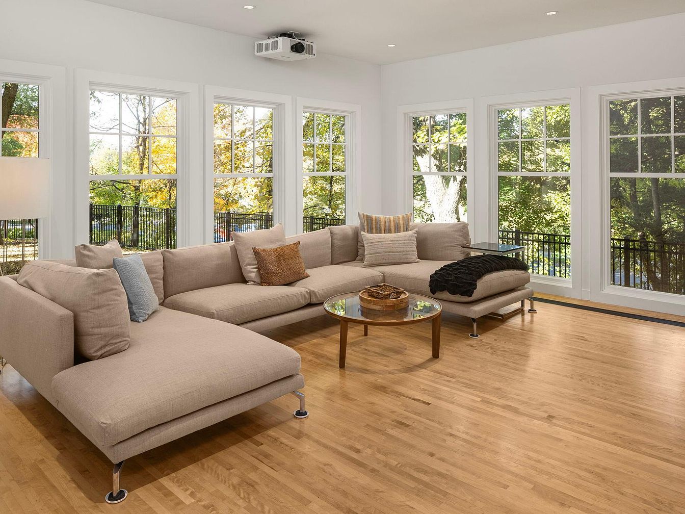 A spacious living room with a warm, inviting atmosphere is showcased through expansive floor-to-ceiling windows that allow ample natural light to pour in. Light hardwood floors contrast with a modern, oversized beige sectional sofa arranged in an L-shape, featuring several assorted throw pillows in earth tones and subtle patterns. A round glass coffee table with wooden legs is placed centrally atop the floor, while a neatly folded black throw blanket adds a cozy touch. Clean white walls and trim enhance the airy, open layout, and a ceiling-mounted projector hints at the room’s dual entertainment purpose.