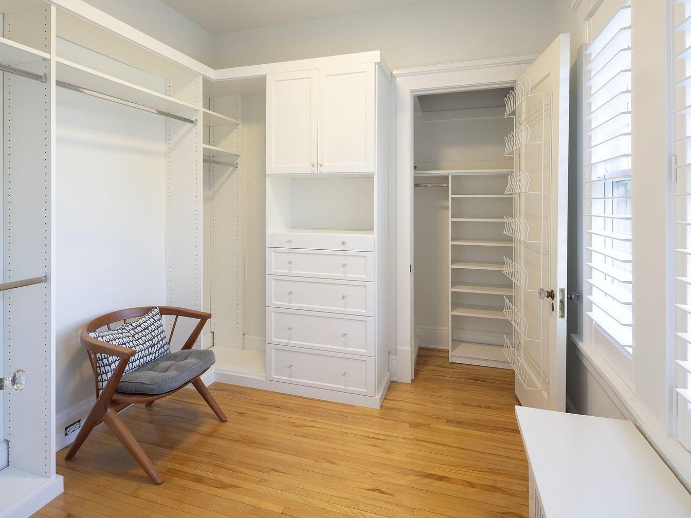 Spacious closet with built-in white shelving and cabinetry, featuring multiple clothing rods and drawers for organized storage. Open shelving units line the left wall, while a set of deep drawers with upper cabinets sits in the center. On the right, a closet door has wire organizers attached and opens to reveal more shelving inside. A large window with white plantation shutters lets in ample natural light. The floor is honey-toned hardwood, which adds warmth to the bright, neutral palette. A contemporary wooden accent chair with a modern geometric cushion is placed in the corner, creating a functional and stylish dressing area.