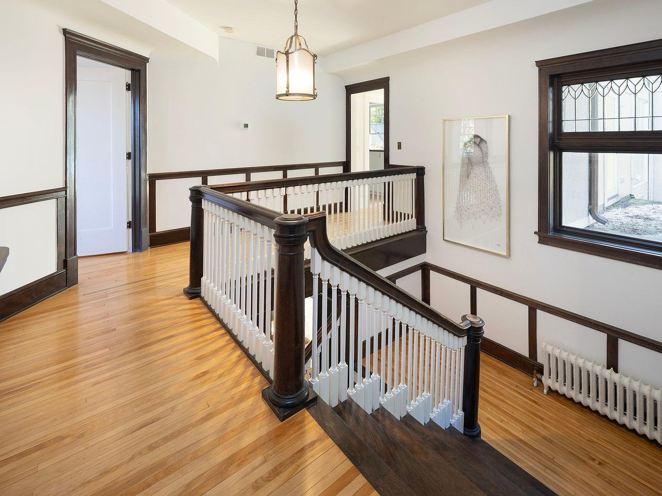 A spacious upstairs landing features honey-toned hardwood floors and crisp white walls with dark wood wainscoting and trim that frame the doors and windows. The prominent staircase balustrade combines robust dark wooden posts with classic white spindles, lending an air of sophistication. A vintage-style radiator sits under a large window with decorative leaded glass at the top. An elegant lantern-style pendant light hangs from the ceiling, casting a soft glow across the space. Minimalist framed art hangs beside the staircase, adding a modern touch to the otherwise traditional, historic ambiance of the area.