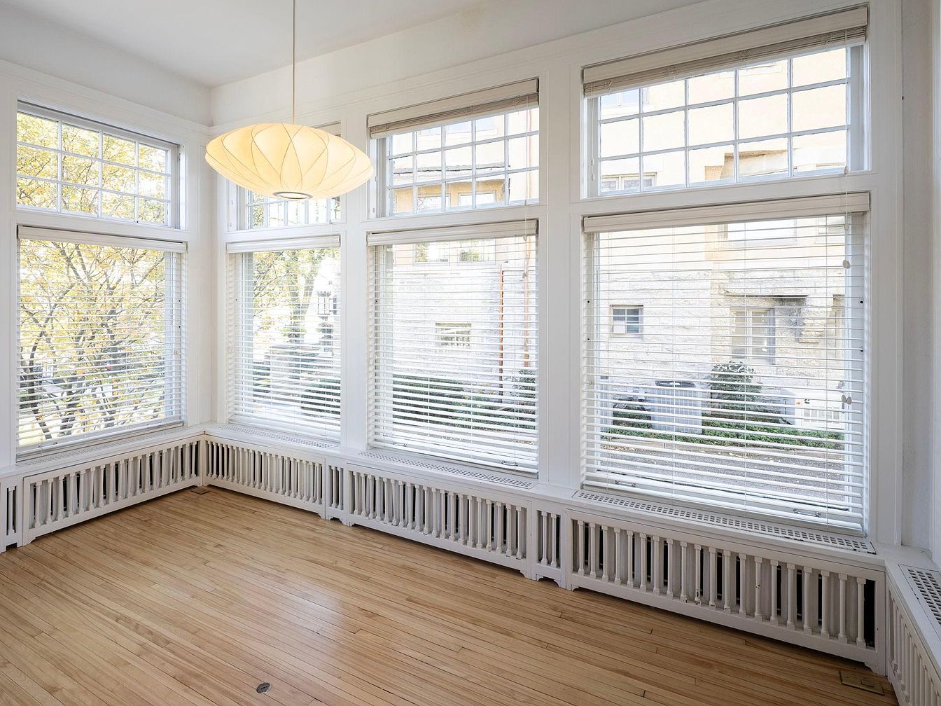 A bright corner room features tall windows wrapping around two walls, flooding the space with natural light. Wide white blinds cover the large window panes, each anchored by transom windows above. Light-colored, glossy wood floors bring warmth, contrasting with the crisp white window trim and matching radiators that run beneath the windows. A sculptural, cream-colored pendant light hangs from the center of the ceiling, adding a modern touch. The room feels spacious and airy, inviting views of trees and neighboring stone buildings outside. The minimalist design highlights clean lines and abundant daylight.